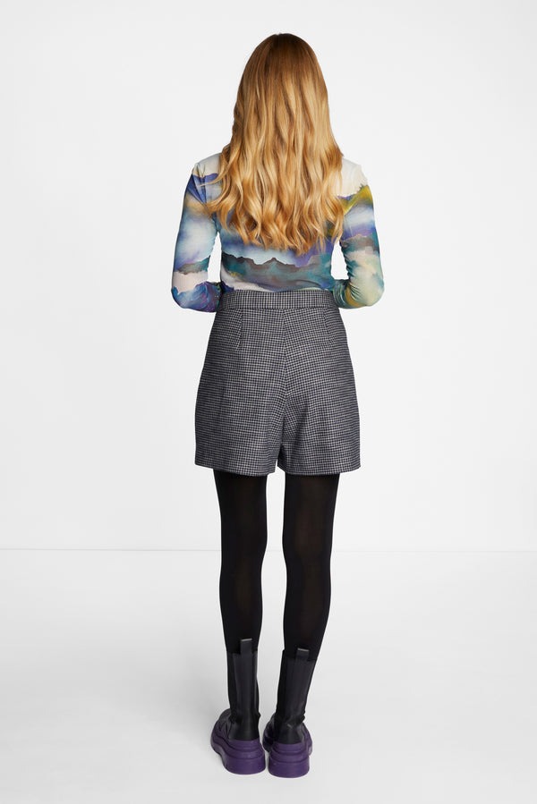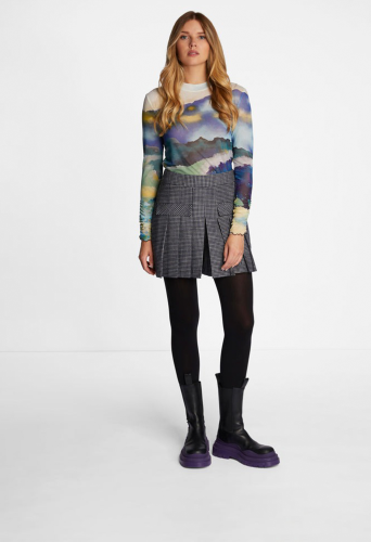 Слегка прозрачный лонгслив из переработанной сетки с размытым пейзажным принтом в акварельном стиле. Облегающий фигуру силуэт с слегка оборками по краю. Длина для размера 42: 64 см. Окружность груди для размера 42: 82 см.