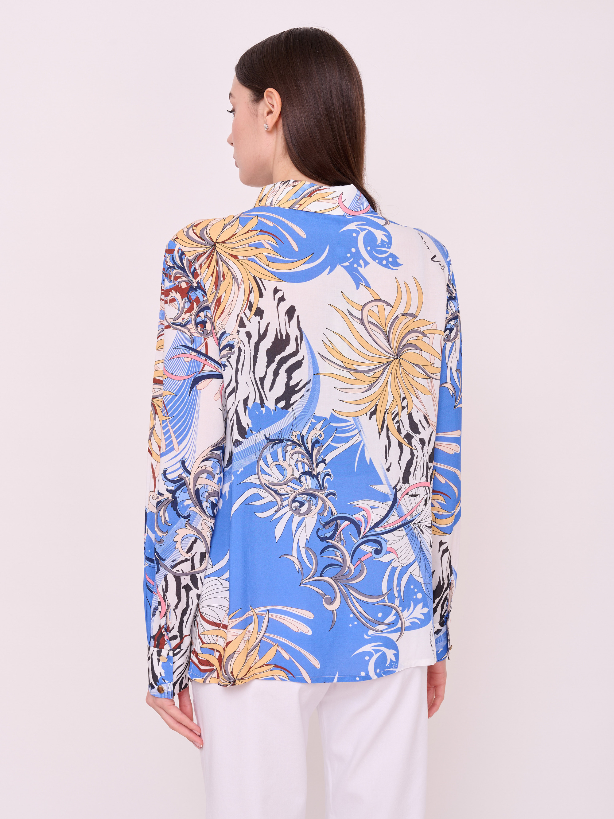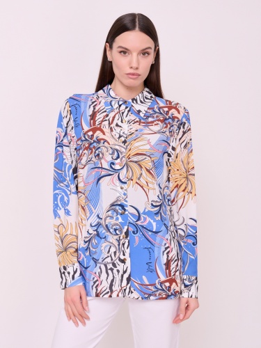 Вискозный текстиль, застежка пуговицы, вырез горловины отложной воротничок, рукава длинные с манжетами на пуговицах, покрой рубашечный, рисунок цветы и растения.