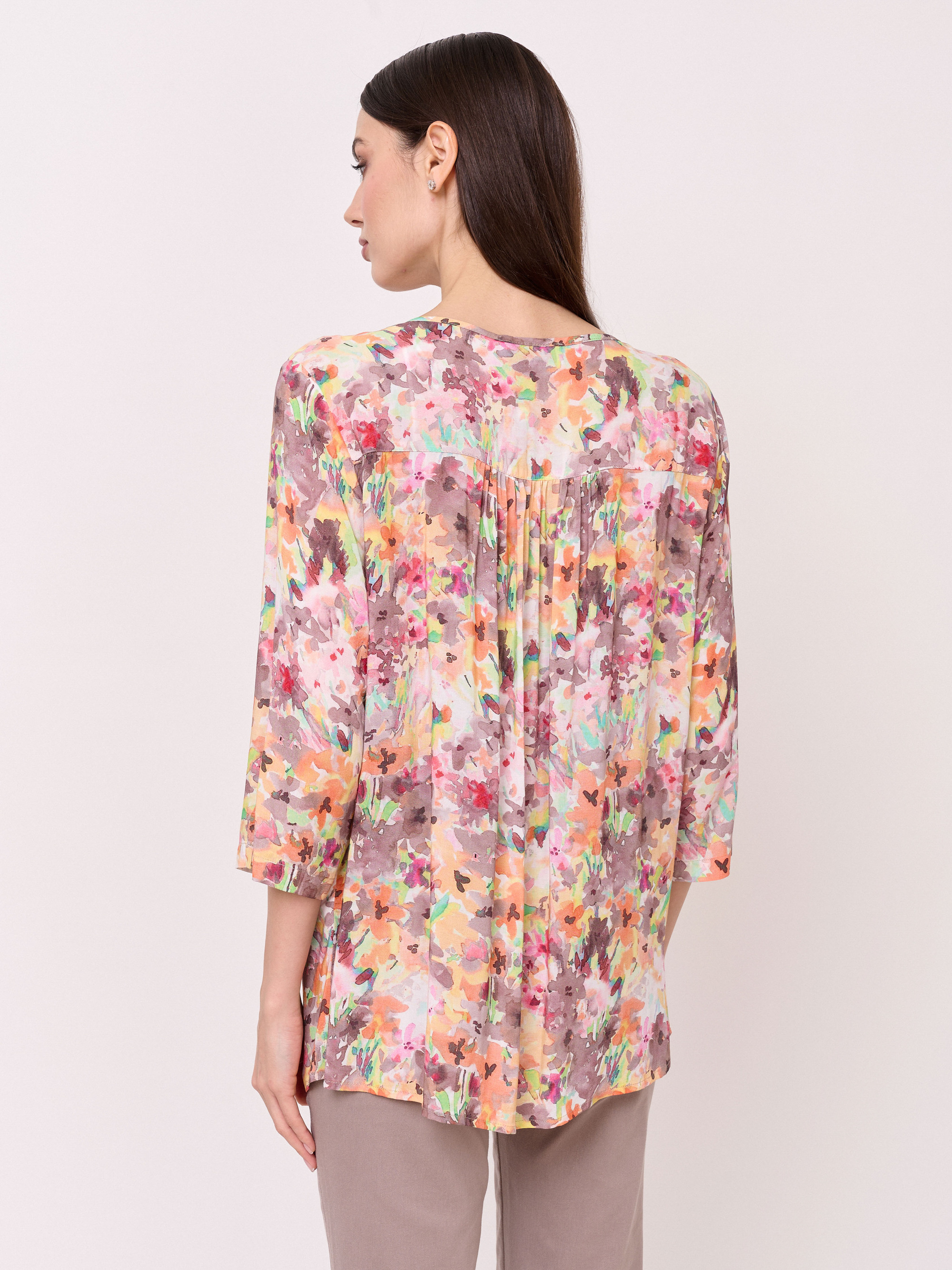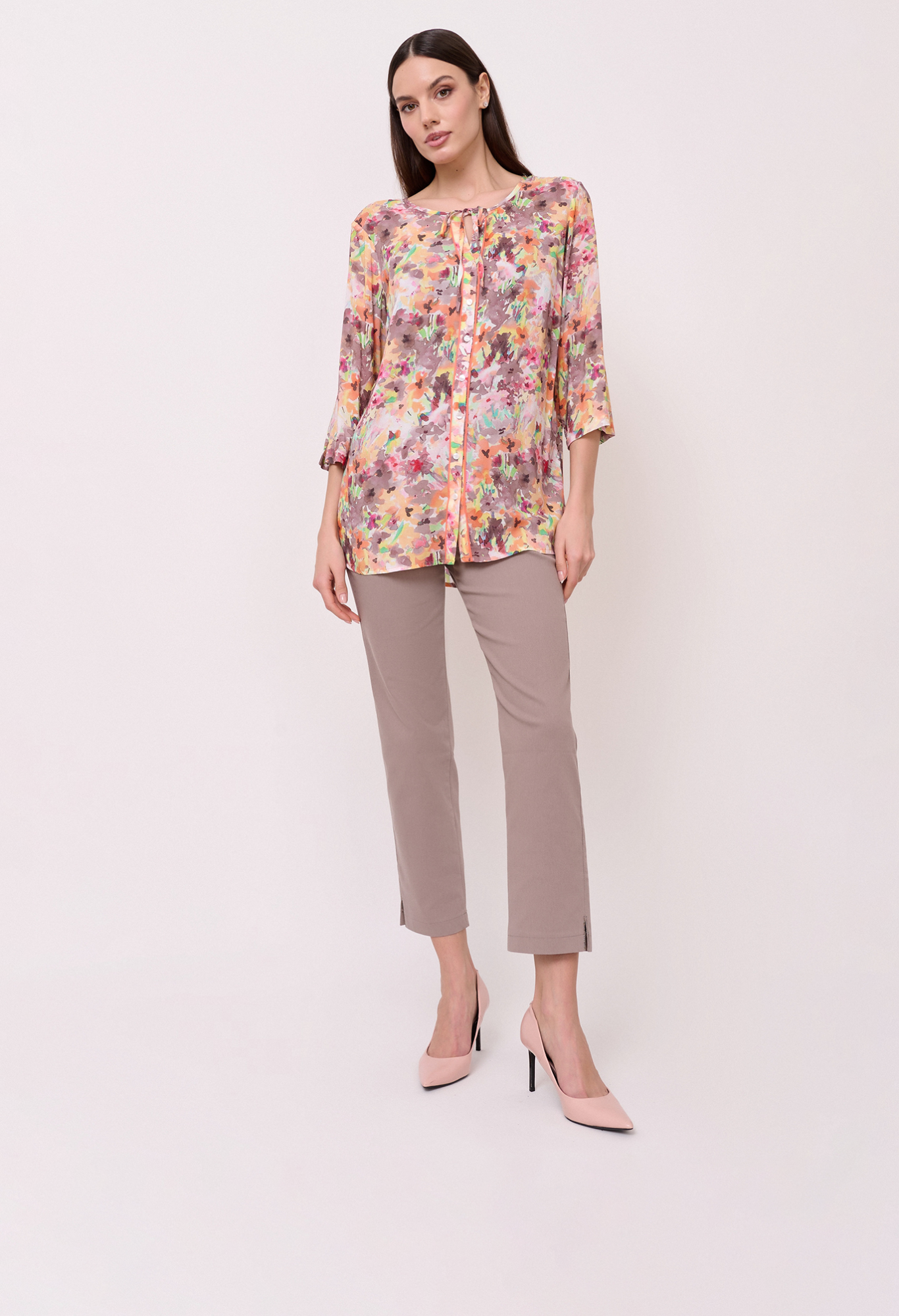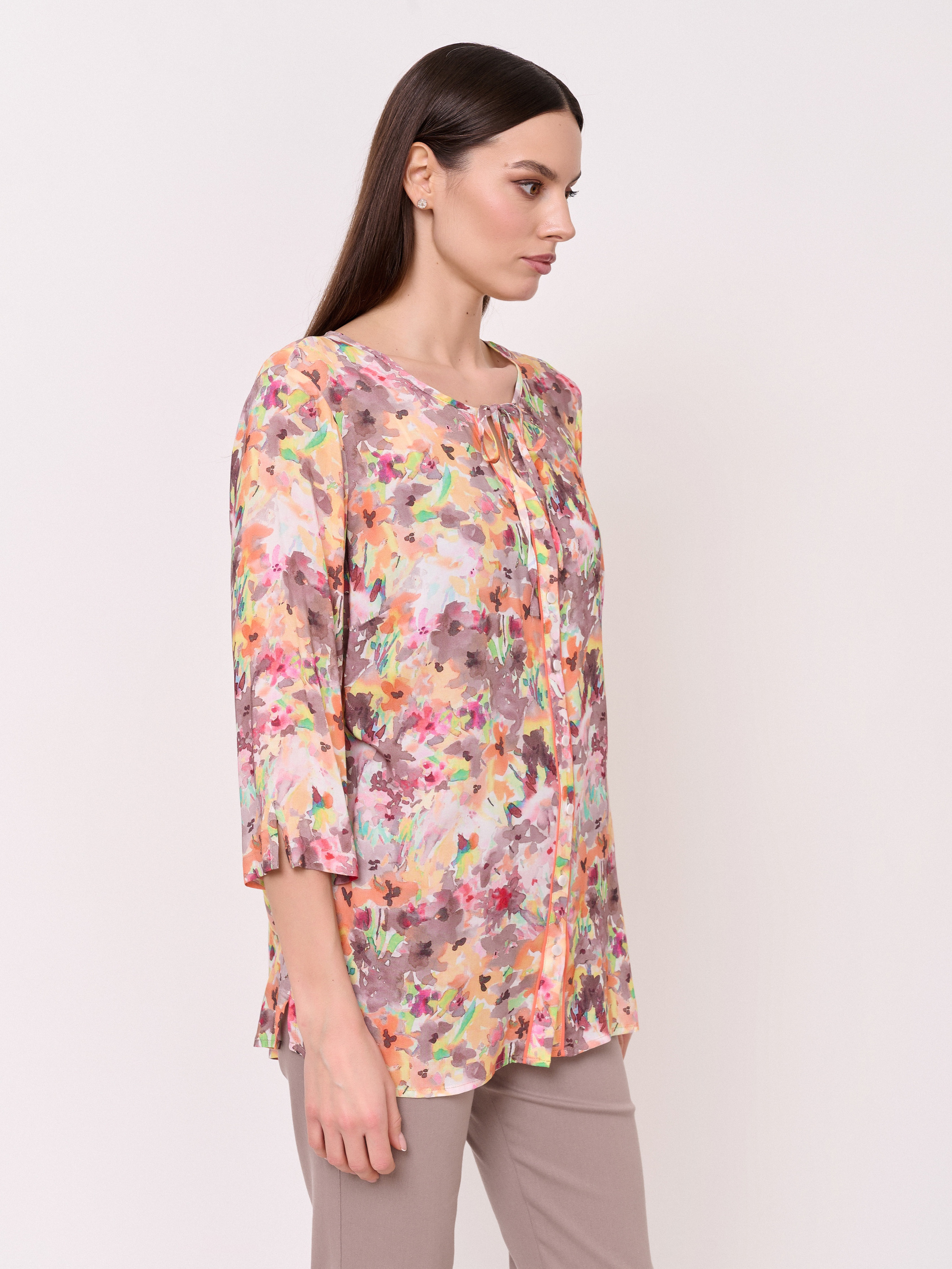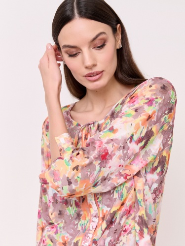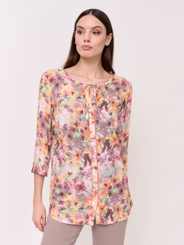 Детали: застежка пуговицы, вырез горловины замочная скважина, рукава 3/4, покрой прямой, рисунок цветы и растения. Длина по спинке: 67 см.