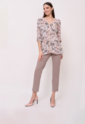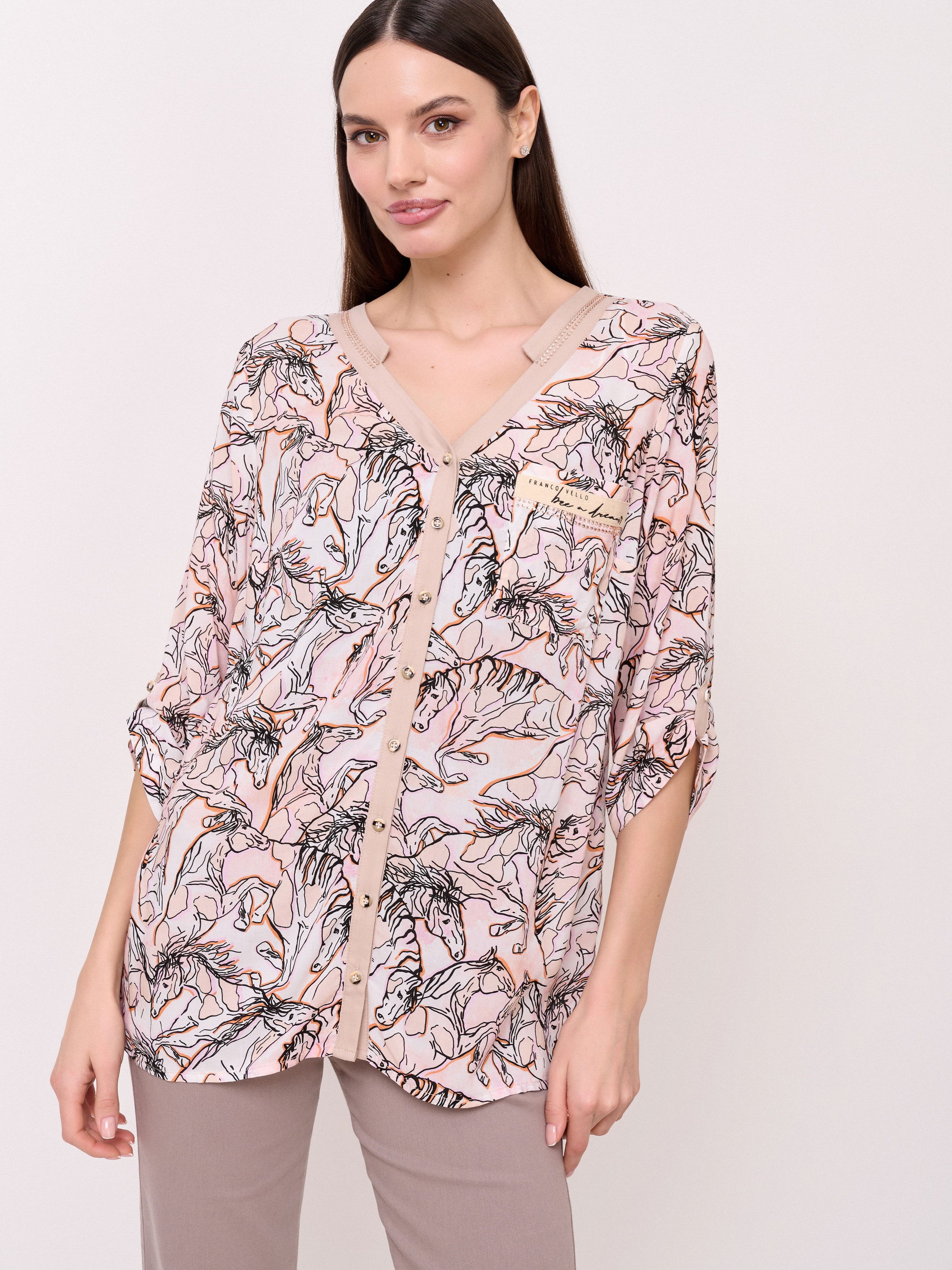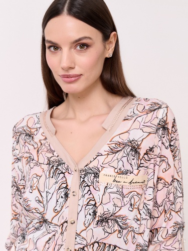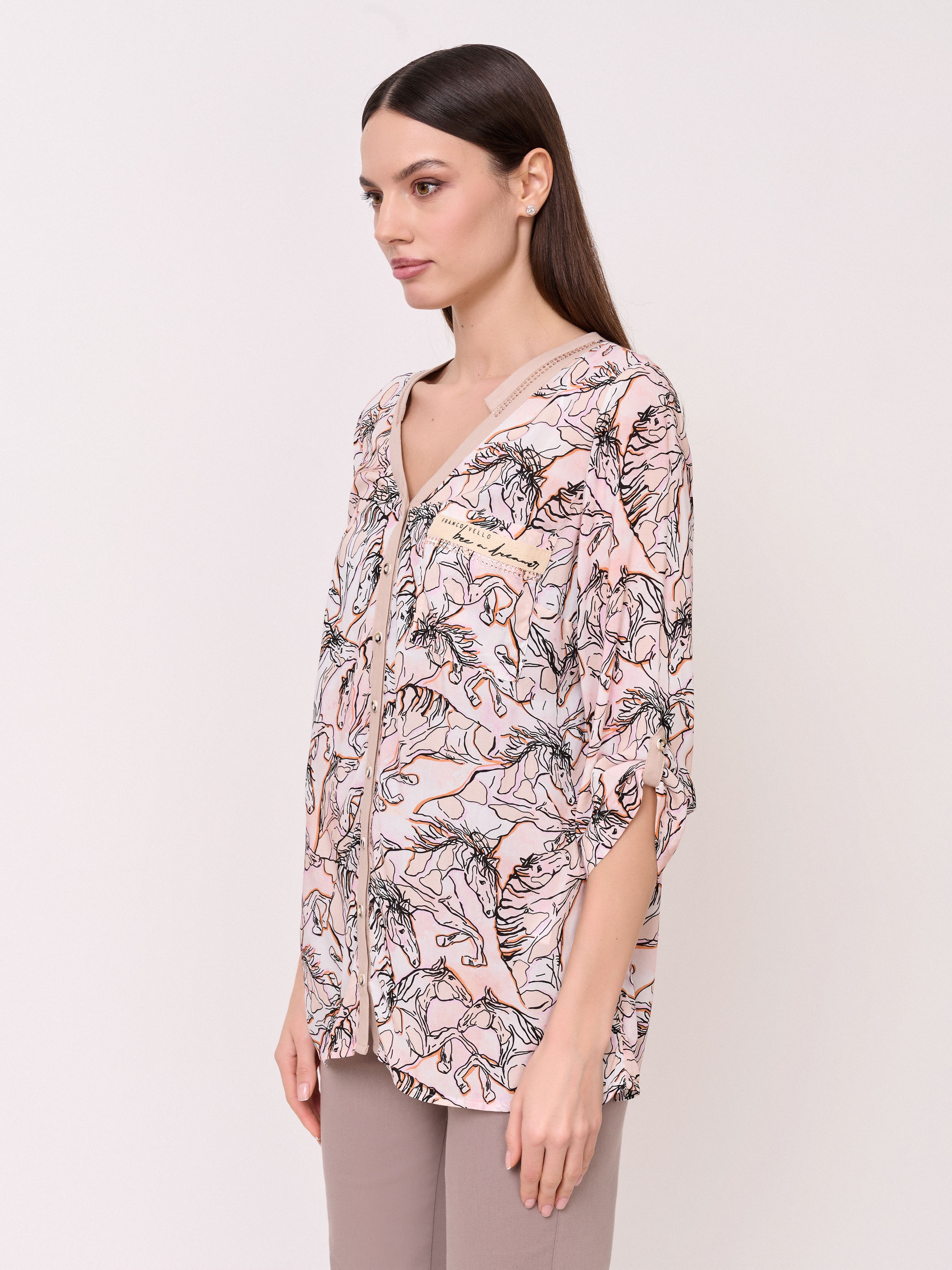 Детали: застежка пуговицы, вырез горловины v-образный, рукава 3/4 с хлястиками на пуговице, покрой прямой, рисунок анималистический, стразы. Длина по спинке: 68 см.