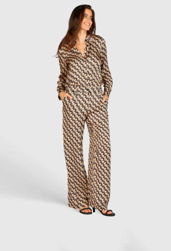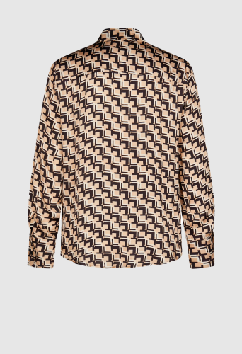 Блузка-рубашка изготовлена из приятного вискозного атласа для максимального комфорта. Графический принт по всей поверхности является ярким акцентом и не прерывается планкой с потайными пуговицами. В сочетании с длинной стрижкой это создает струящийся образ с вау-эффектом.