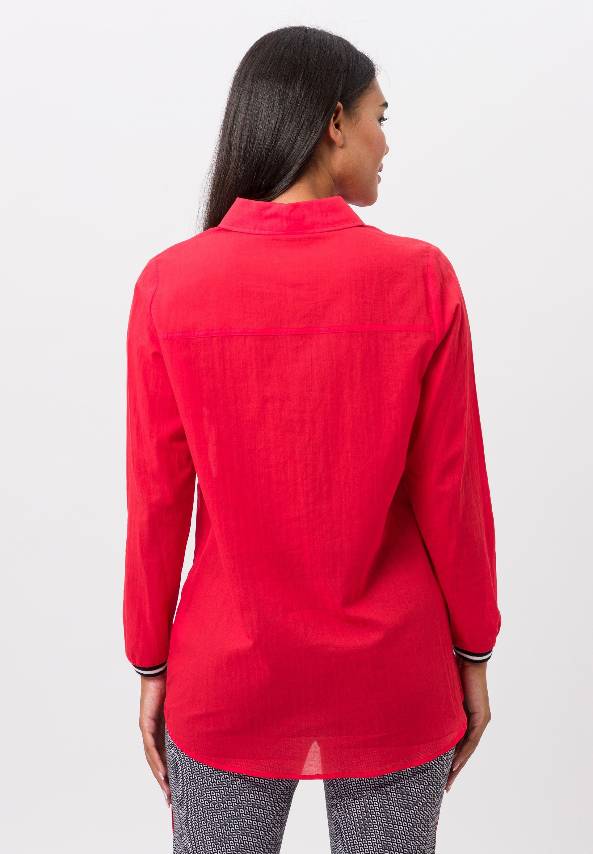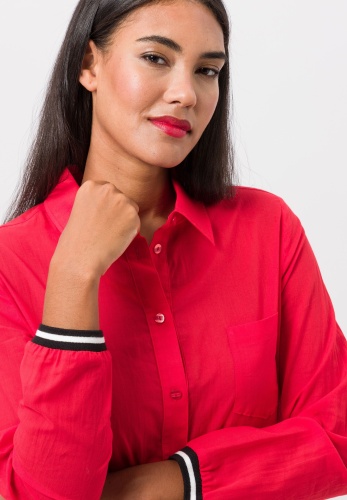 Длинная женская блузка с контрастными манжетами.Удлиненная блузка станет стильным дополнением любого повседневного гардероба. В дополнение к своим классическим особенностям, таким как воротник блузки, планка на пуговицах и нагрудный карман, элегантный дизайн блузки представлен в спортивном стиле полосатыми контрастными манжетами на рукавах и небольшим принтом над подолом. Длинная модель, облегающая фигуру, и легкая хлопчатобумажная ткань чрезвычайно удобны в носке. Эта длинная блузка также отлично смотрится как легкий жакет в расстегнутом виде.