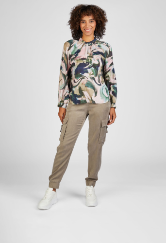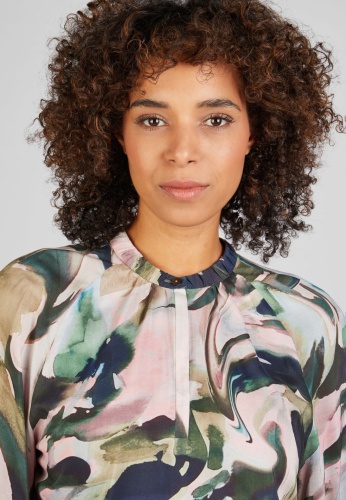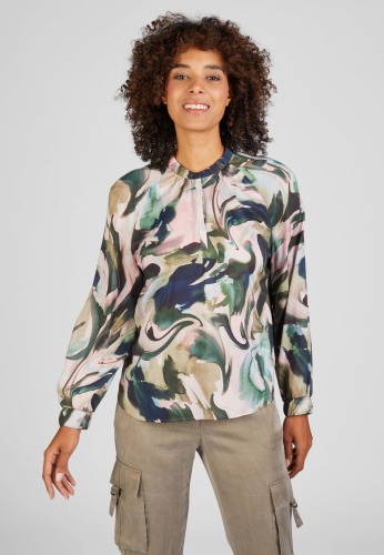 Блузка с длинными рукавами и шикарным воротником-стойкой станет прекрасным дополнением вашего гардероба. Их особой изюминкой является абстрактный узор по всей поверхности, который добавляет нотку креативности и стиля.