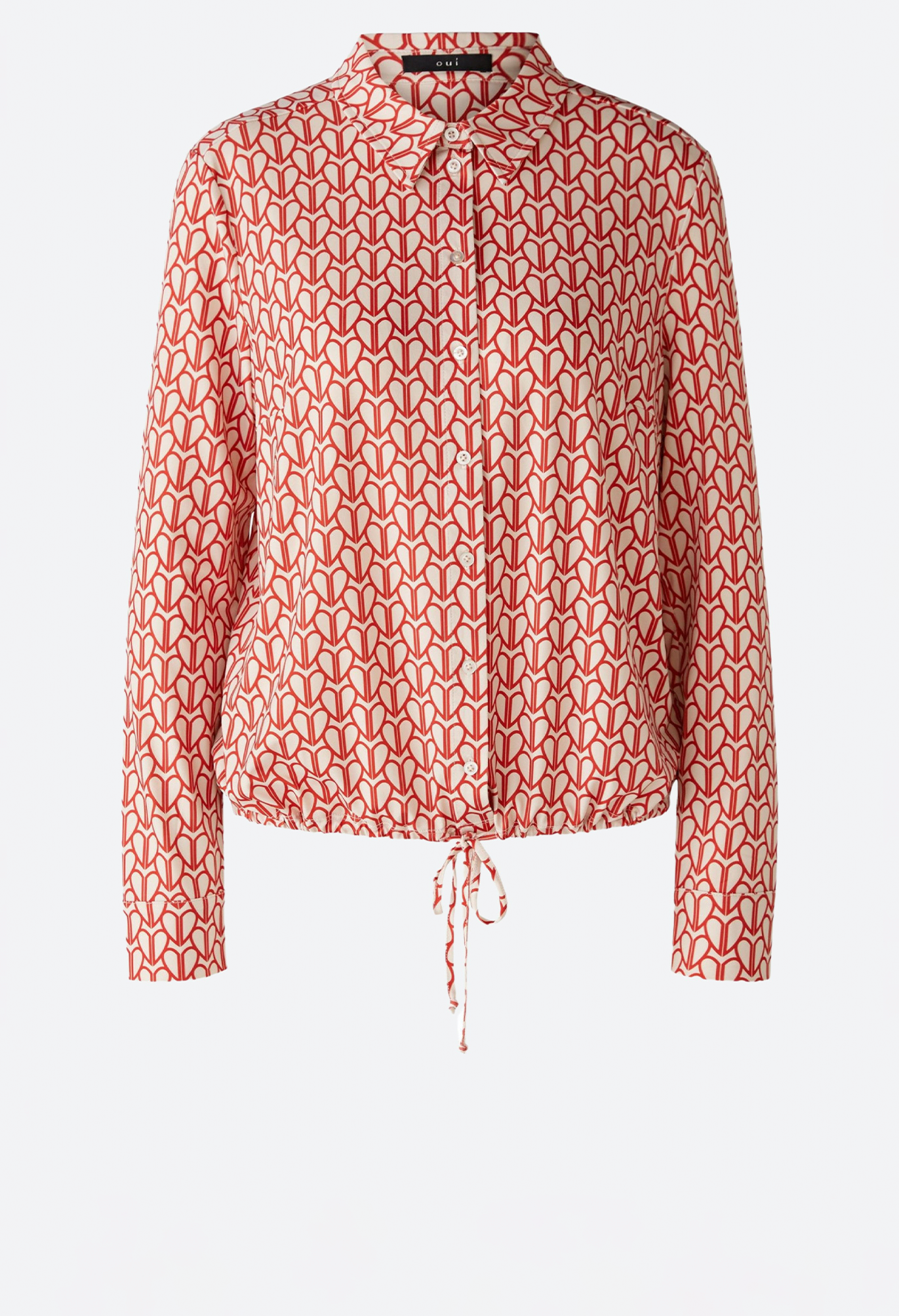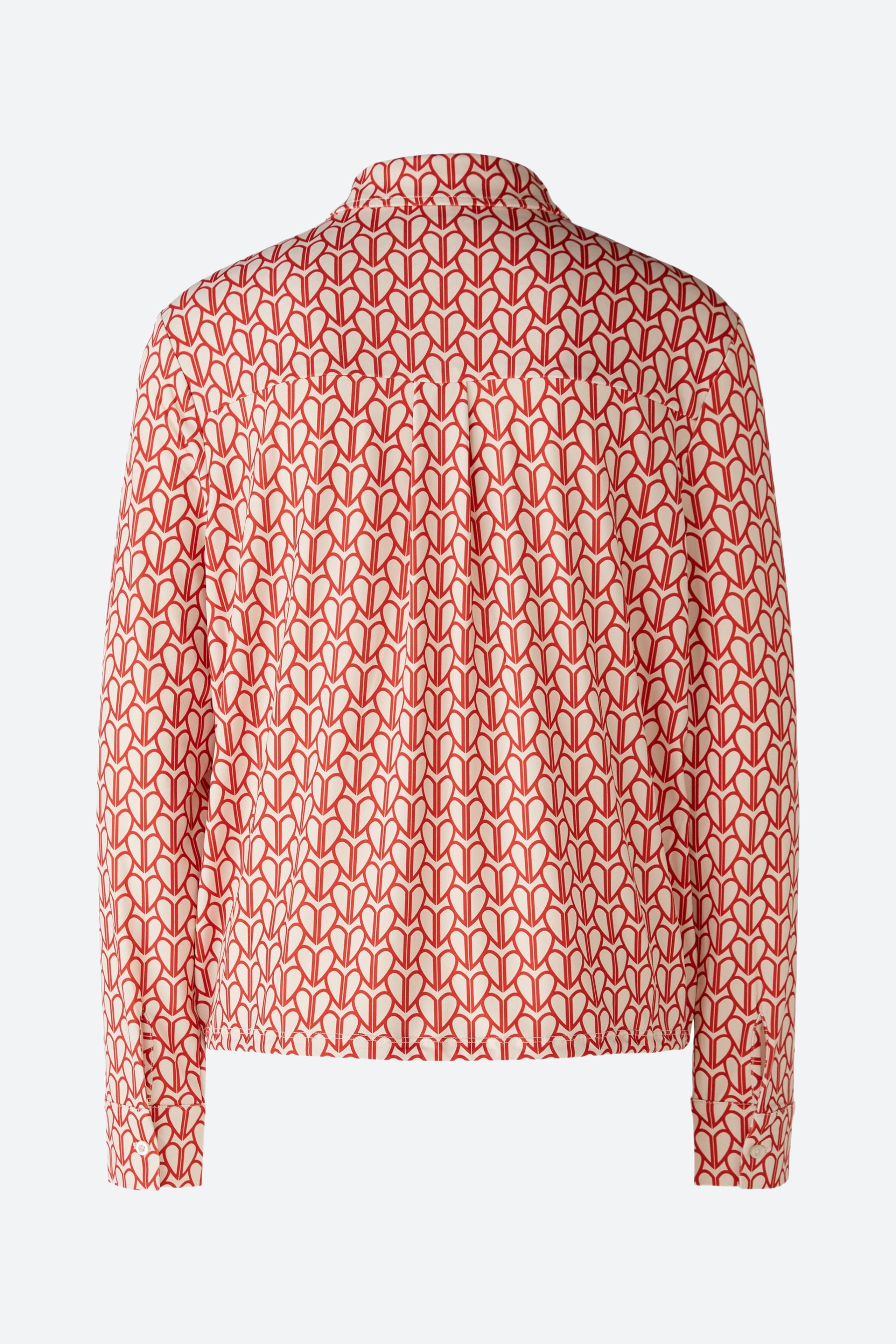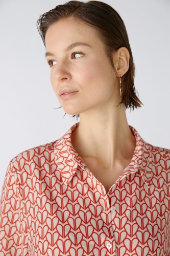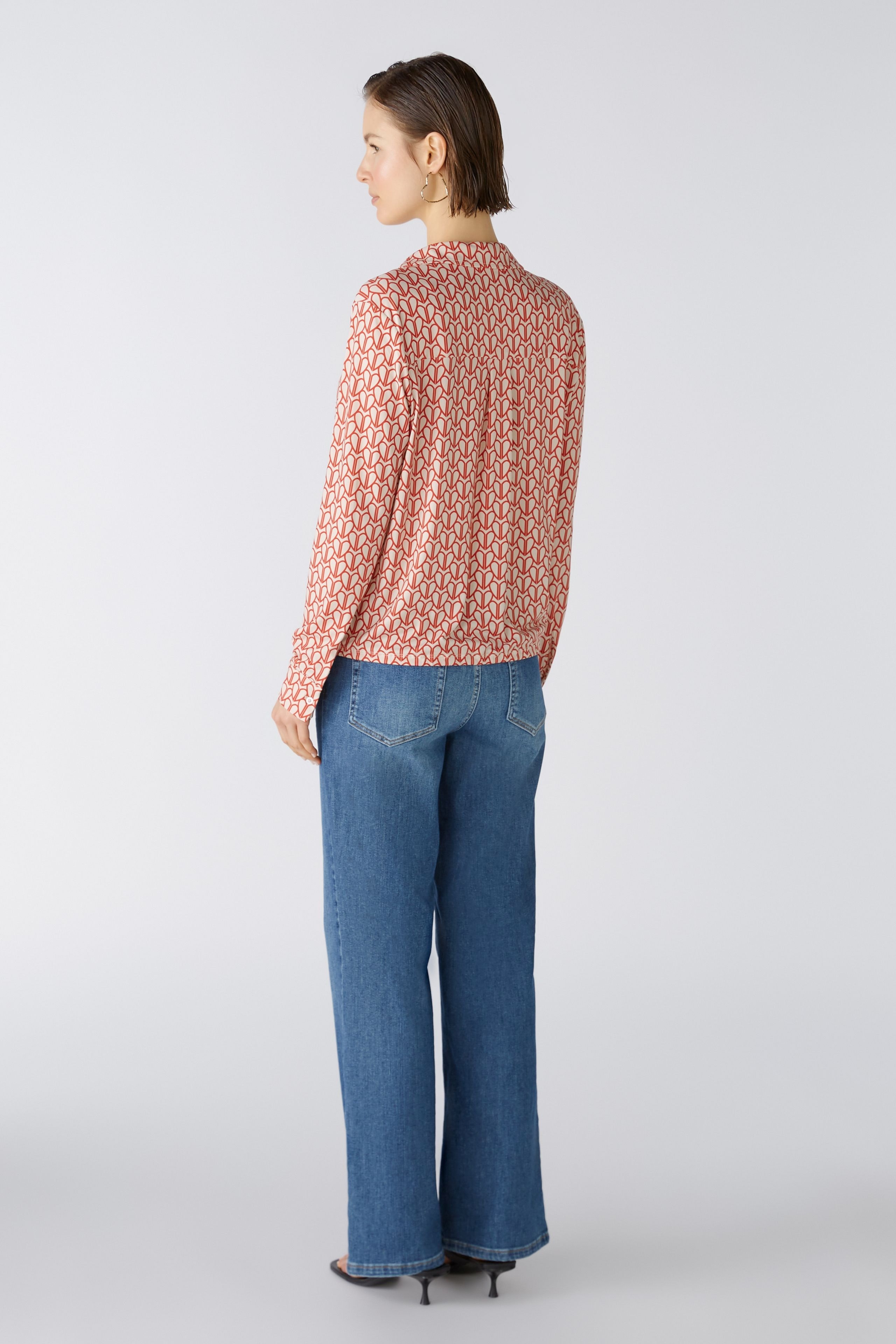 Струящаяся, немнущаяся, шелковистая на ощупь ткань с высоким содержанием эластана, с принтом по всей поверхности. Повседневный крой, укороченная длина. Классический воротник рубашки с планкой на пуговицах во всю длину. Длинный рукав с манжетами, застежка на пуговицы. Пояс можно собрать лентой или носить расстегнутым, прямо, как куртку. Длина для размера 42: 58 см.