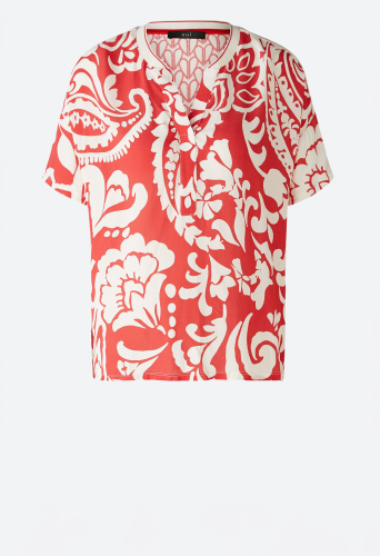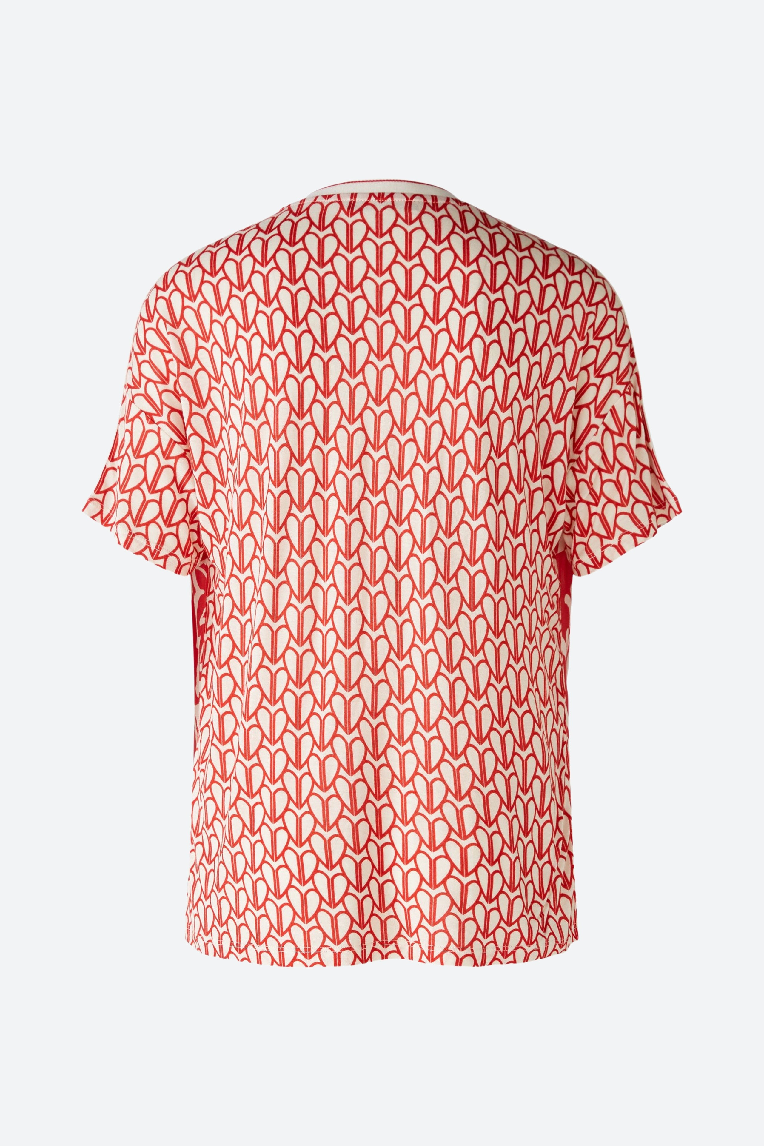 Легкая блузка в нашивном стиле со спортивными полосатыми деталями. Нашивка из вискозы: тканая спереди, трикотажная сзади. Повседневный крой, стандартная длина. Вырез туники с трикотажной ребристой отделкой. Вырез плеча, рукав свободно переходит в короткий рукав. Контрастная полосатая лента на плече. Длина для размера 42: 64 см.