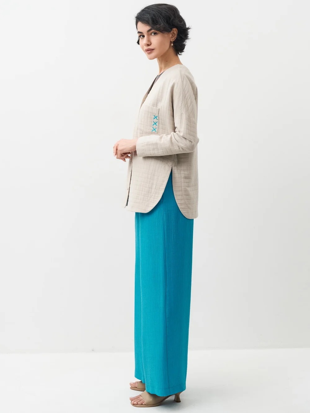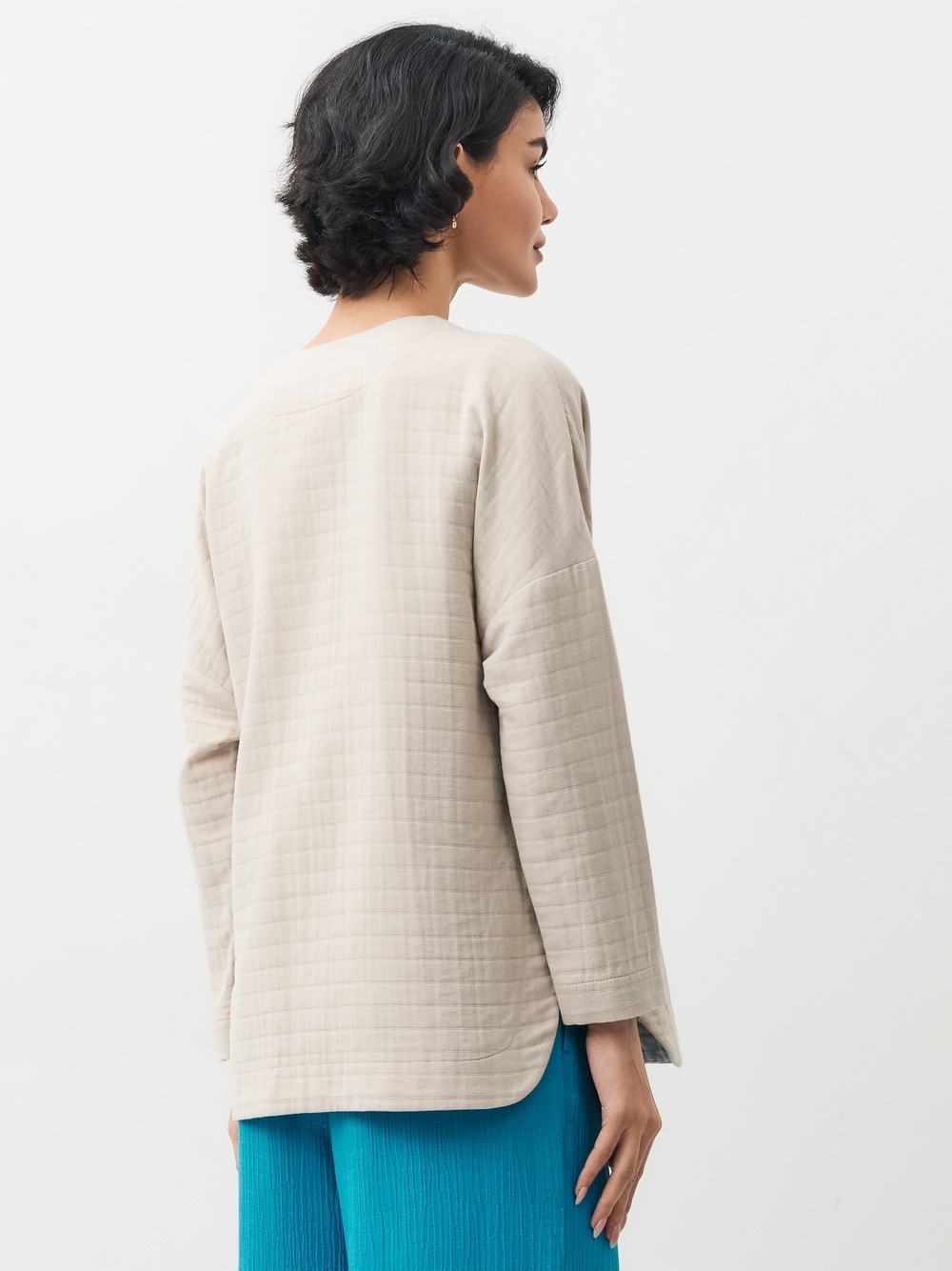 Блузка прямая, свободная. Горловина с А-образным вырезом. На левой полочке, в области груди, накладной карман. Спинка прямая. Рукав чуть заужен книзу. Застежка на пуговицы. Низ блузки закругленный по боковым швам, переходящий в высокие разрезы, обработанные притачной обтачкой.