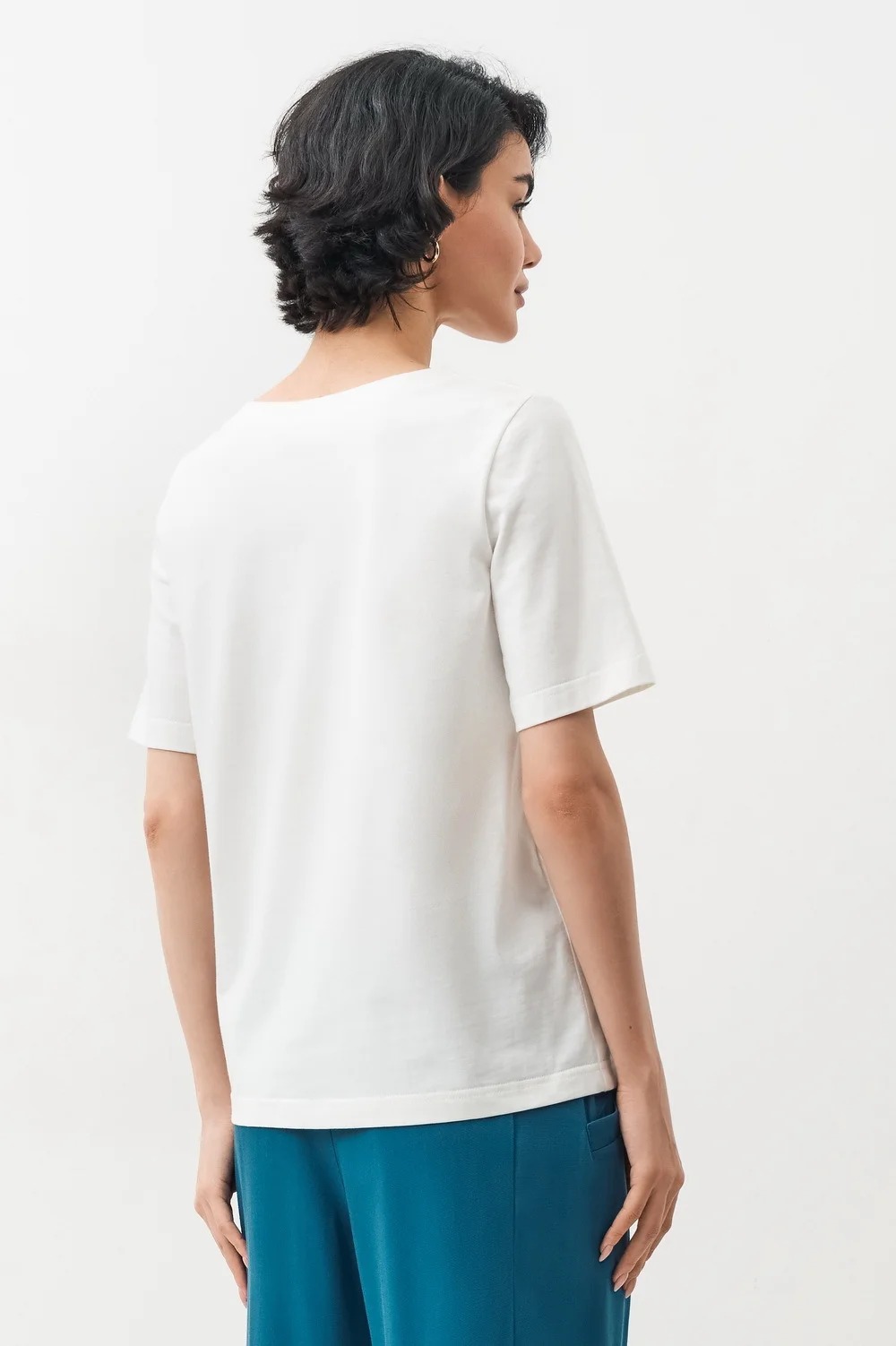 Блуза прямая. Горловина лодочкой. Полочка декорирована настрочными вертикальными деталями - полосками из ткани контрастных цветов.