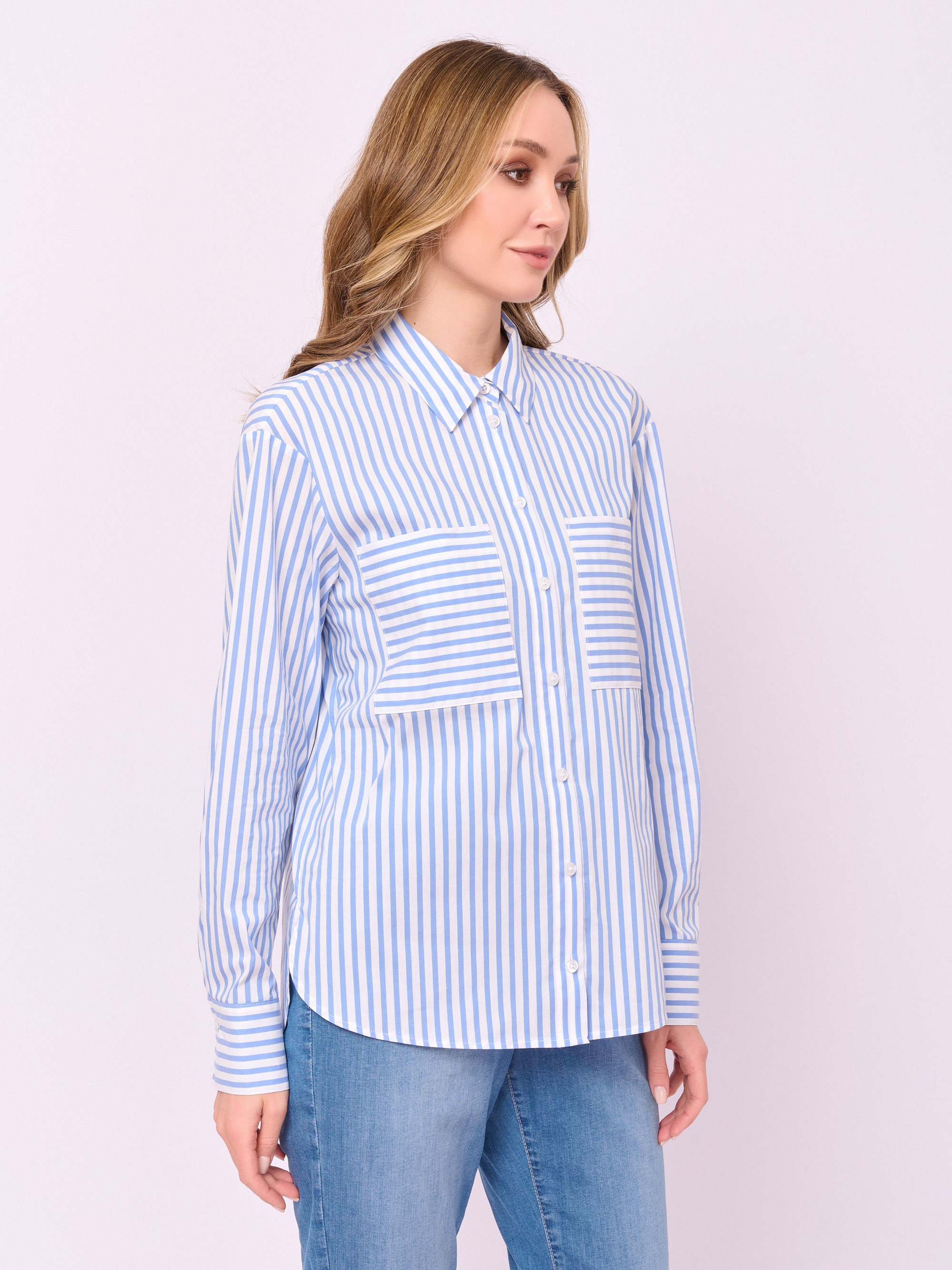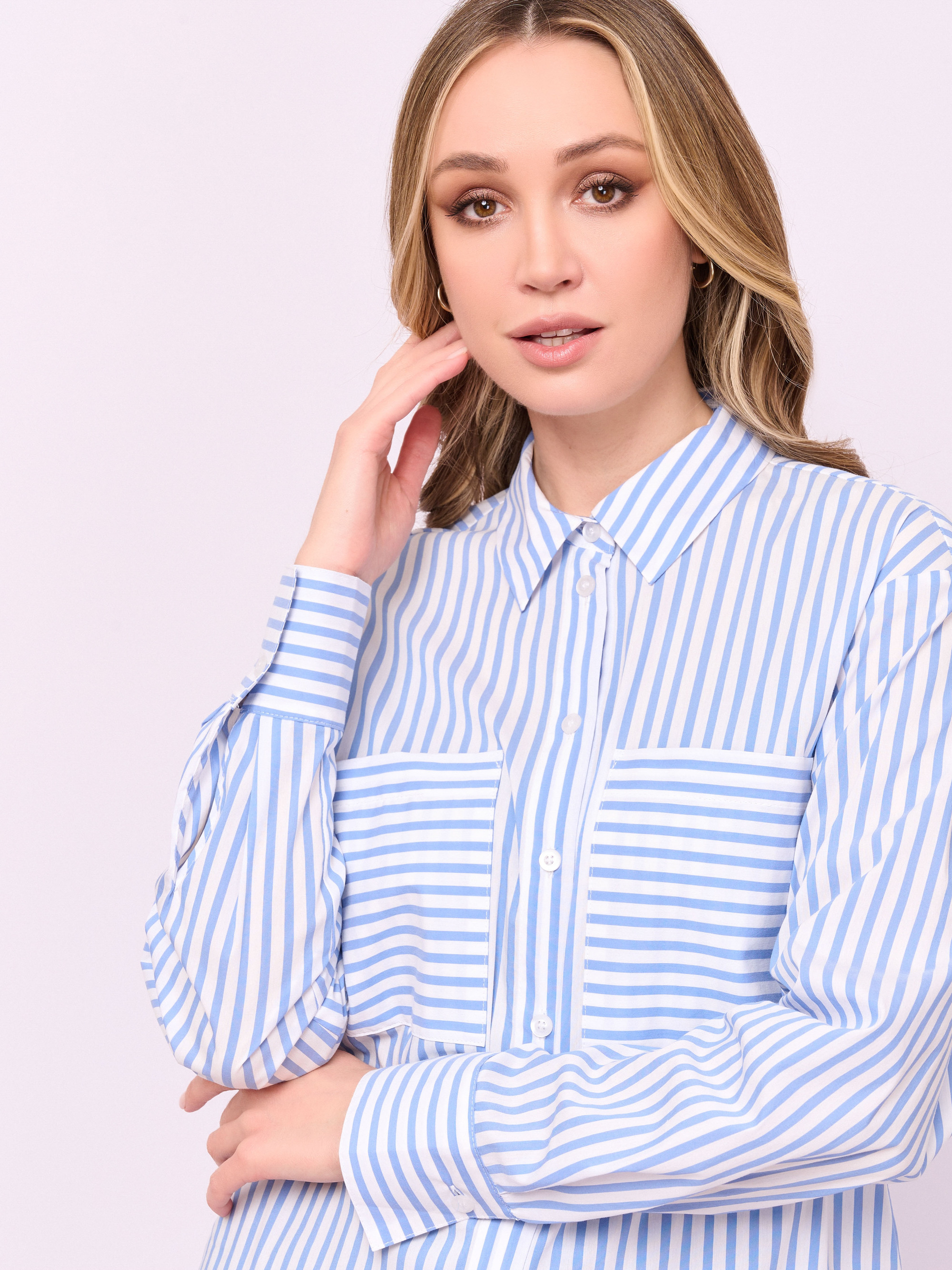 Детали: застежка пуговицы, вырез горловины отложной воротничок, рукава длинные, покрой рубашечный, рисунок полоска, боковые разрезы. Длина по спинке: 67 см.