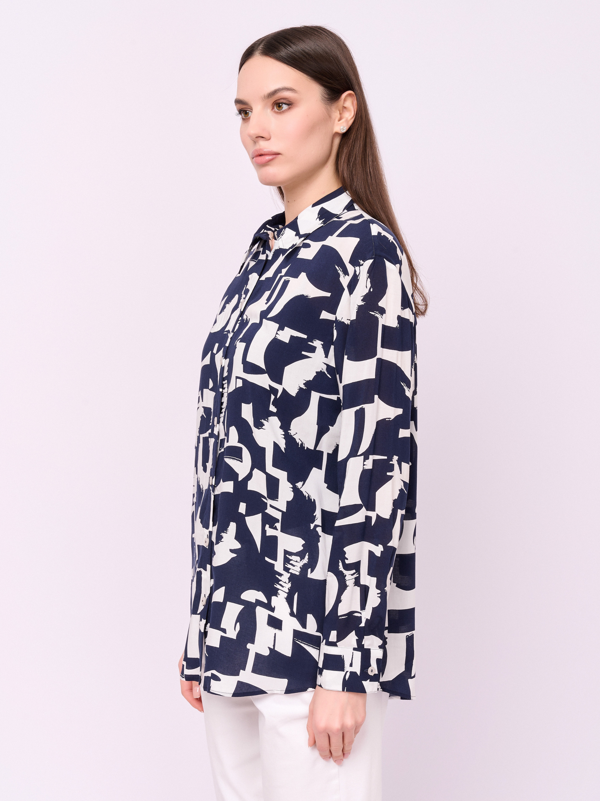 Детали: застежка пуговицы, вырез горловины отложной воротничок, рукава длинные, покрой рубашечный, рисунок абстракция. Длина по спинке: 70 см.