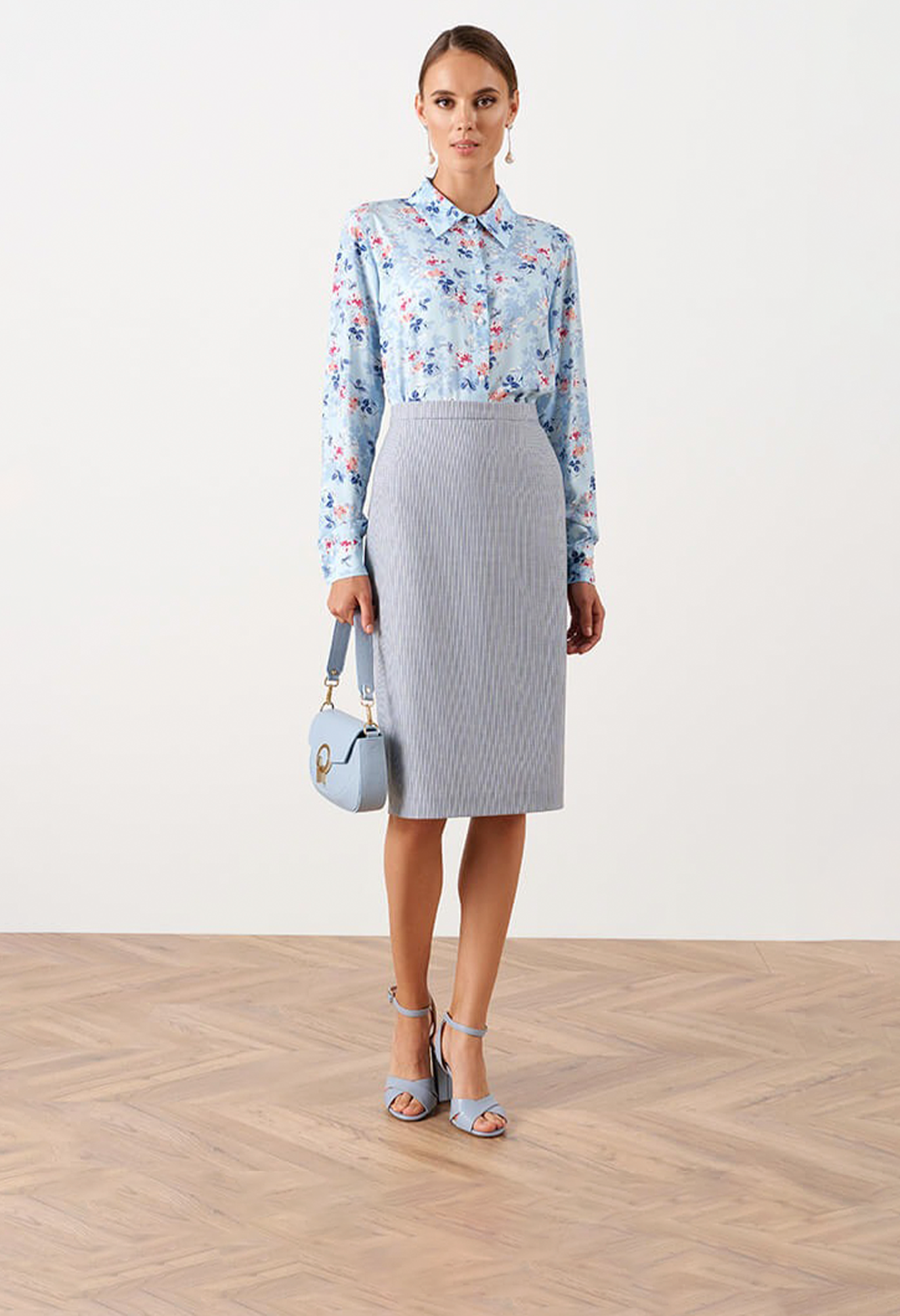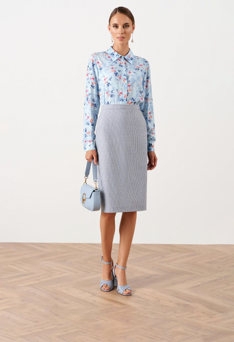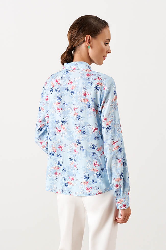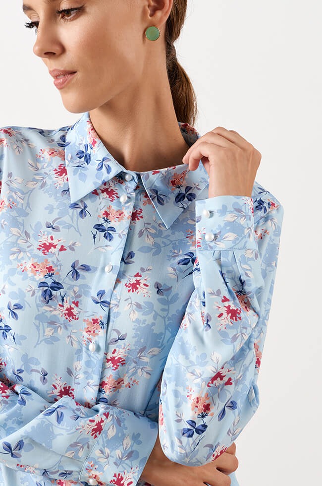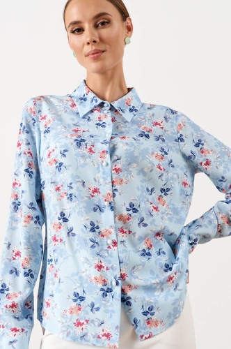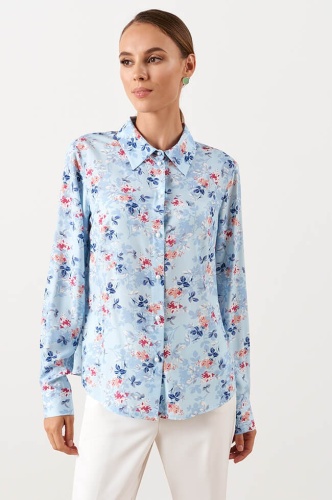 Романтичная блузка свободного силуэта, выполнена из принтованного полотна «Цветы в тени». Отложной воротник-стойка. Центральная застежка на пуговицы. Рукава сосборены на манжеты с разрезом и застежкой на пуговицы. В шов манжеты заложены складки. Спинка и перед с плавным закруглением по низу.