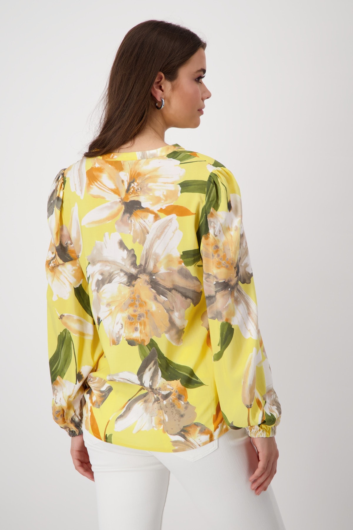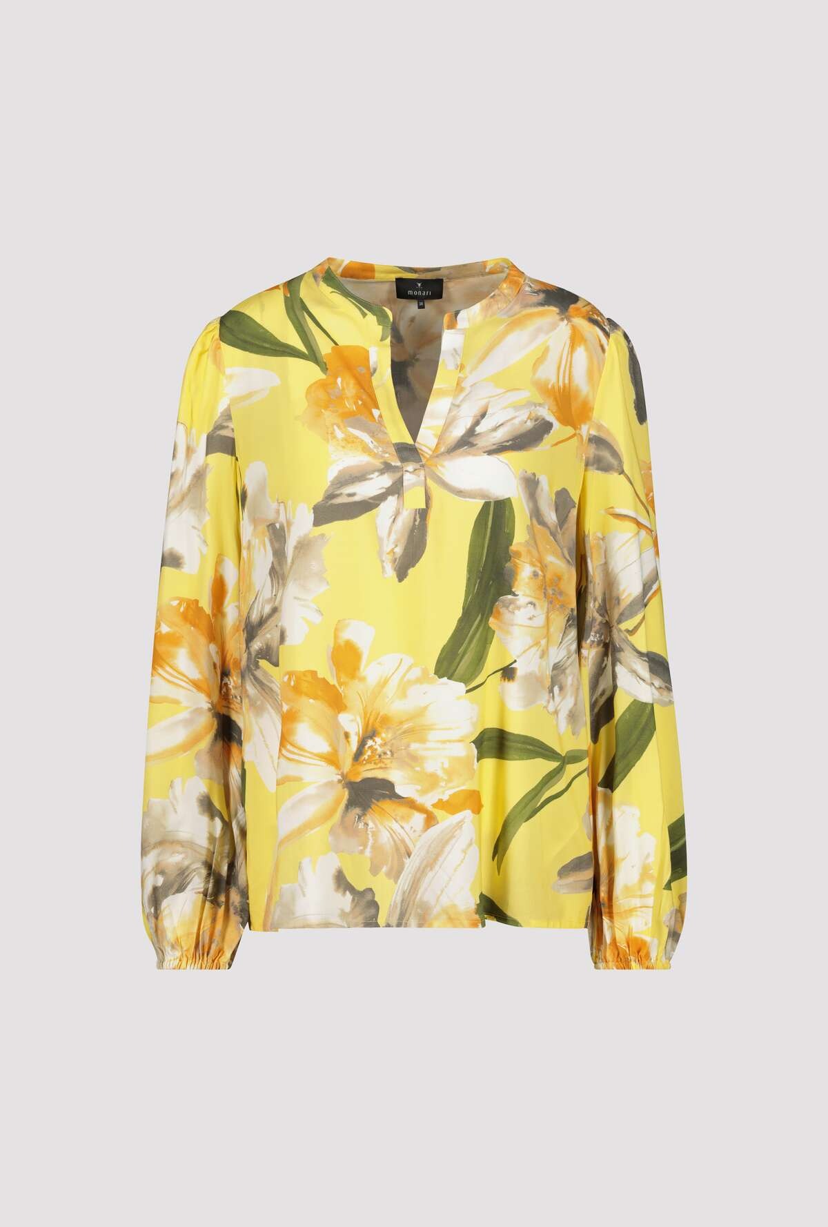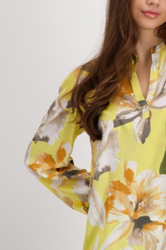 Блузка с цветочным принтом из 100% вискозы с вырезом под горло. Регулярная посадка. Круглый вырез горловины с разрезом. Длинный рукав. Взъерошенное плечо. Подол рукава на резинке. Закругленный подол. Длина 44 размера 67 см.