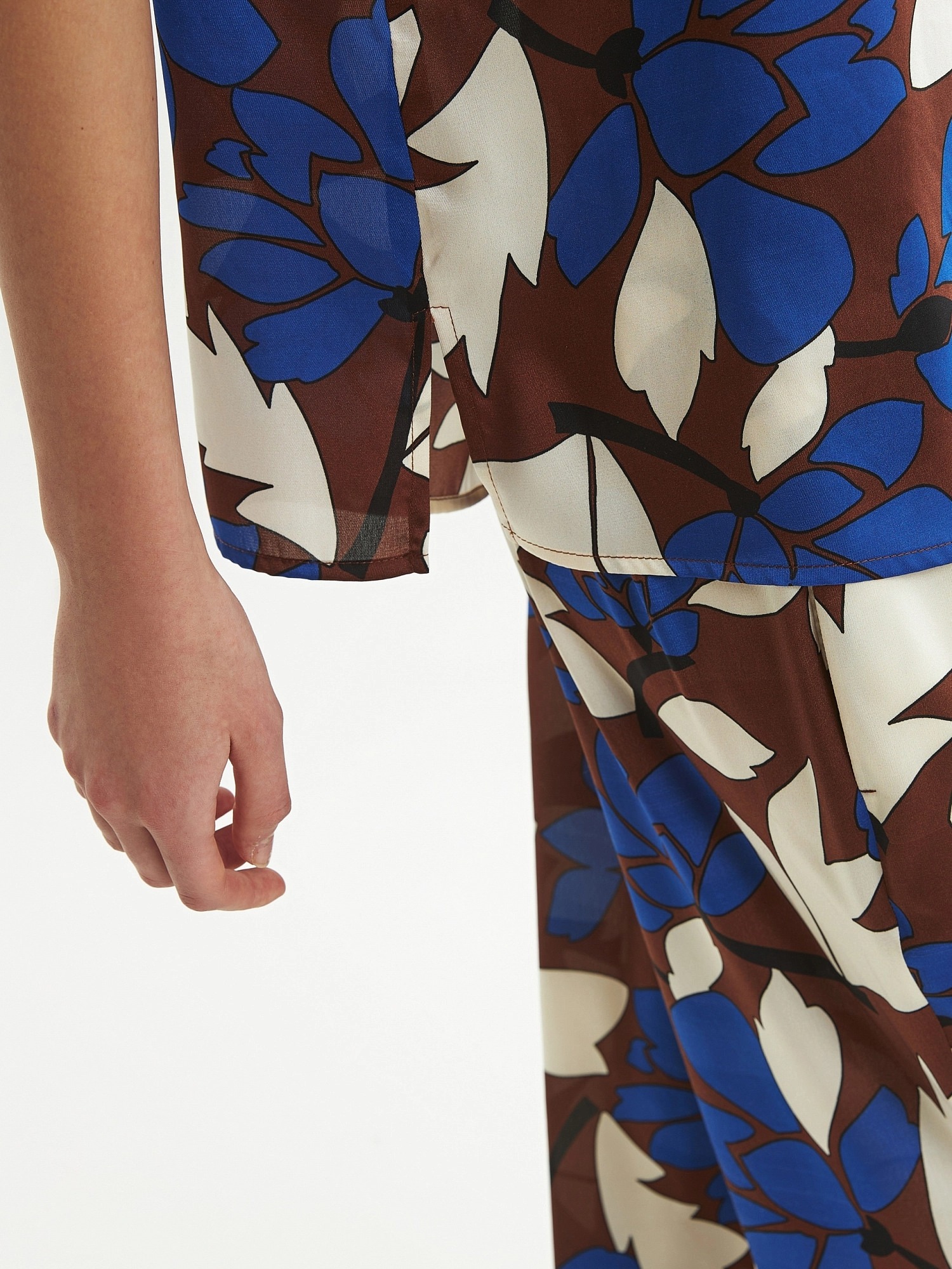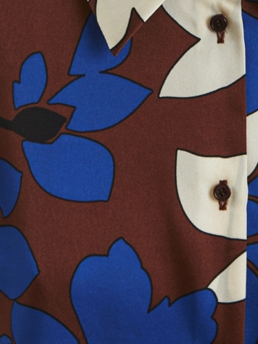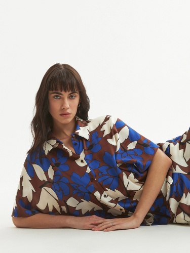 Блуза из плательной ткани с крупным цветочным принтом, прямого силуэта с укороченным рукавом кимоно, классическим отложным воротником и застежкой на пуговицы. По низу по бокам небольшие разрезы.