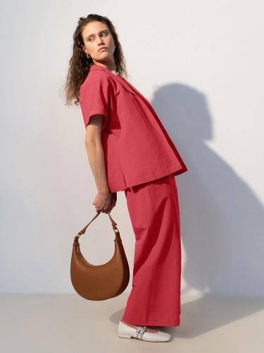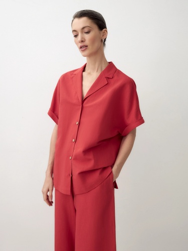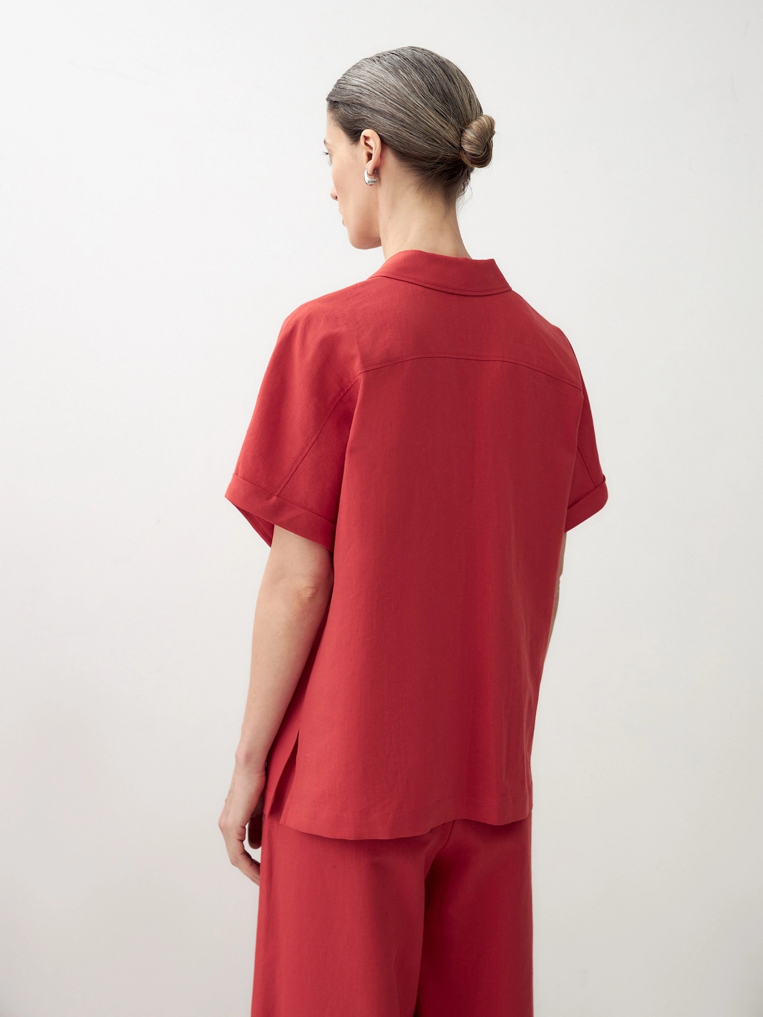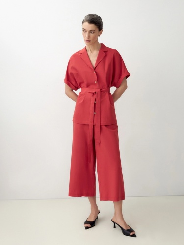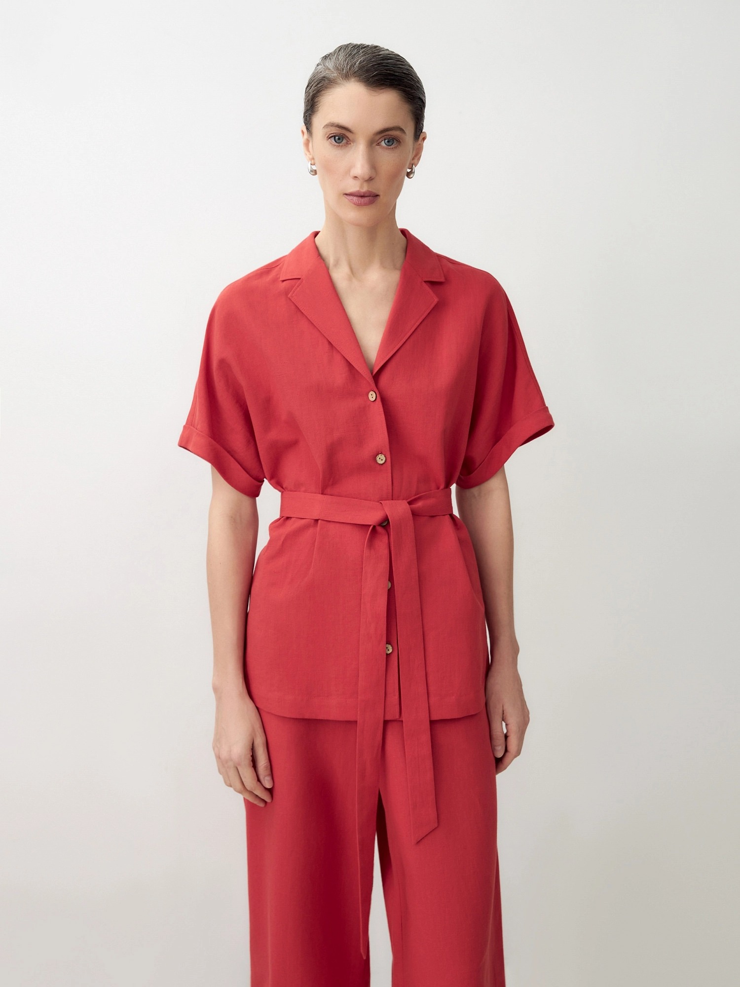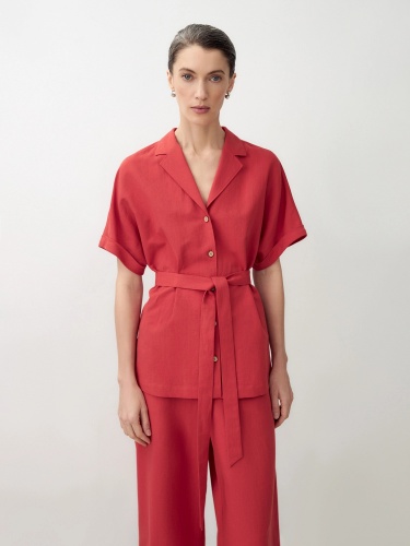 Блуза из льняной ткани с цельнокроеным рукавом и английским воротником. На спинке кокетка, пуговицы по борту. Вместе с брюками из одной ткани составят идеальный комплект для офиса или прогулки по городу. Пуговицы выполнены из кокоса. В комплект входит пояс из основной ткани.