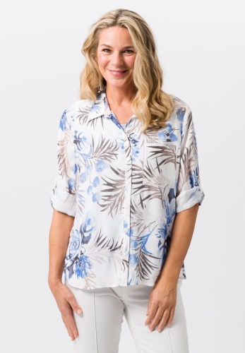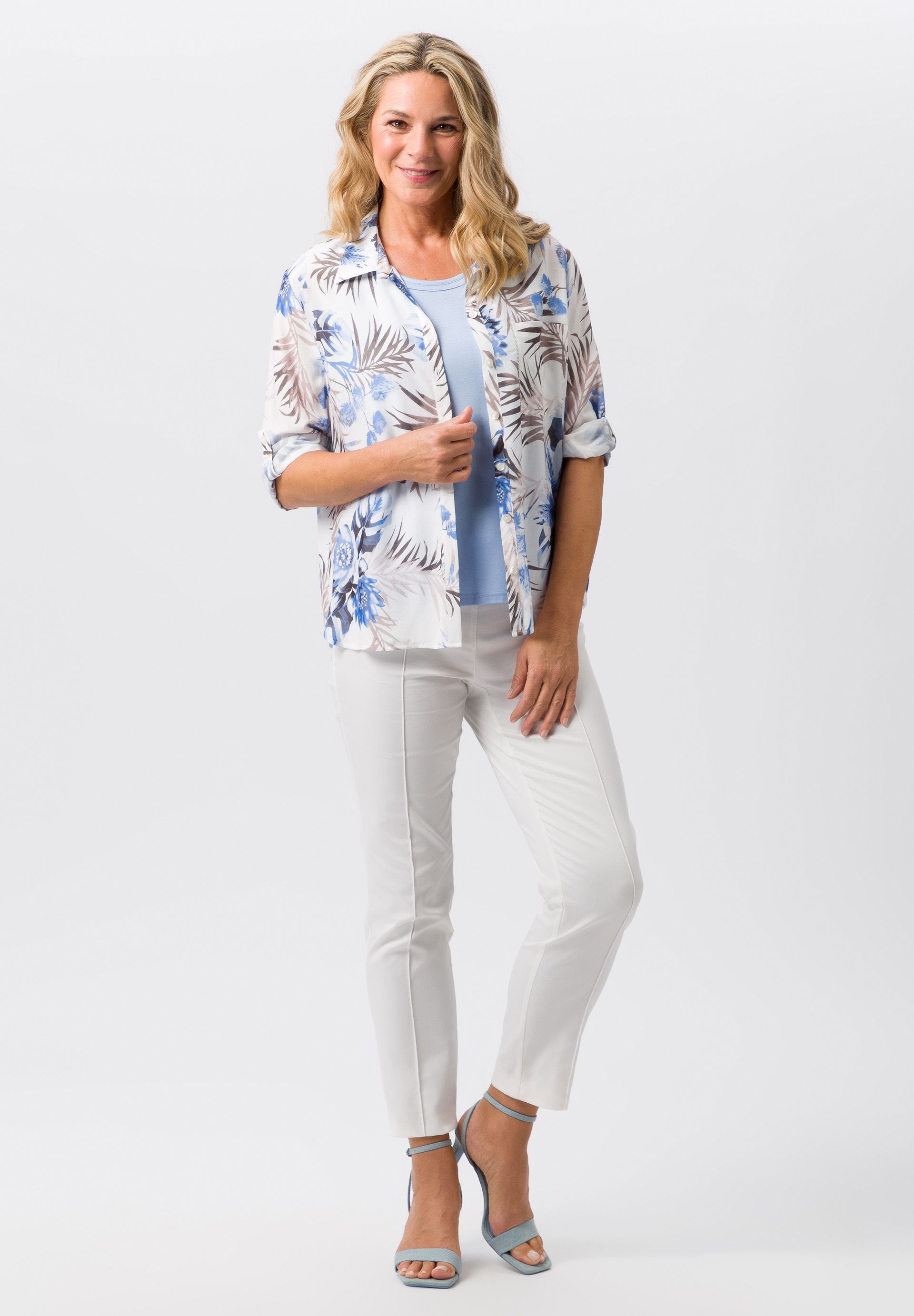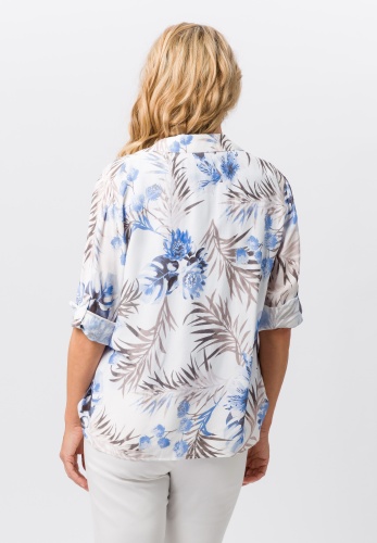 Блузка с цветочным принтом. Блузка длиной до бедра, длиной 3/4 руки, изготовленная из высококачественного хлопка, с регулируемым ремешком обеспечивает максимальный комфорт. Современный воротник рубашки и узкая планка на пуговицах подчеркивают современный характер, а нагрудный карман с декоративной лентой расставляет тонкие акценты. Длина в 42 размере 62 см