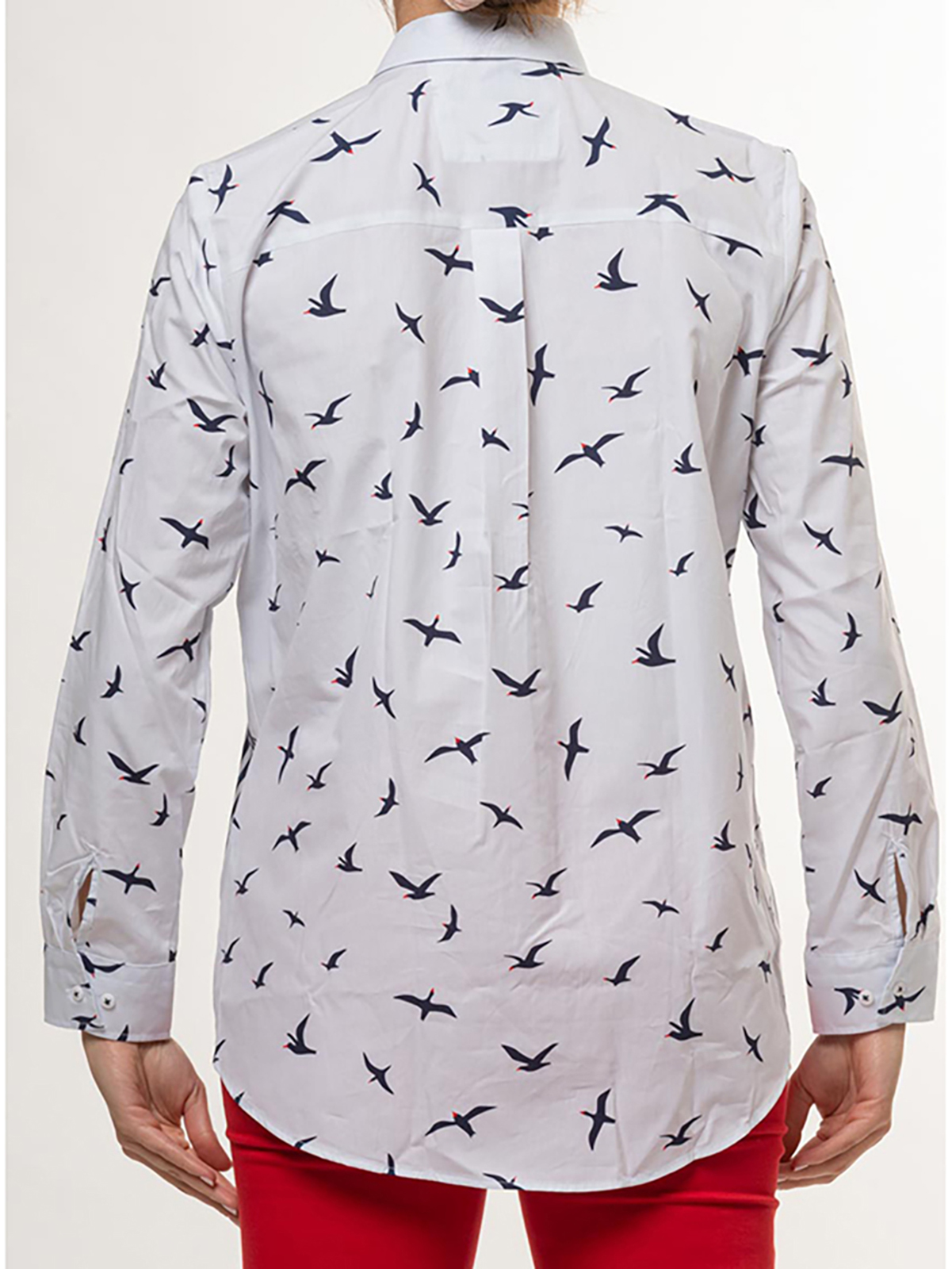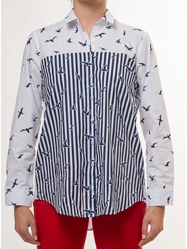Рубашка классического кроя в морском дизайне. Отложной рубашечный вортник, втачной рукав полной длины с манжетой. Застежка на пуговицы в тон изделия. Удлиненная скругленная спинка.