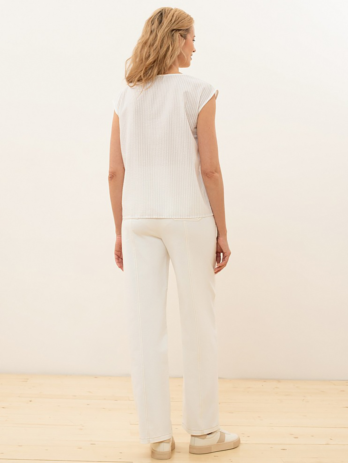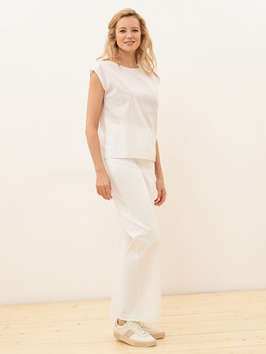 Топ прямого кроя с круглым вырезом из ткани в рубчик молочного оттенка. Топ можно носить навыпуск или заправлять в юбку или брюки с высокой посадкой.