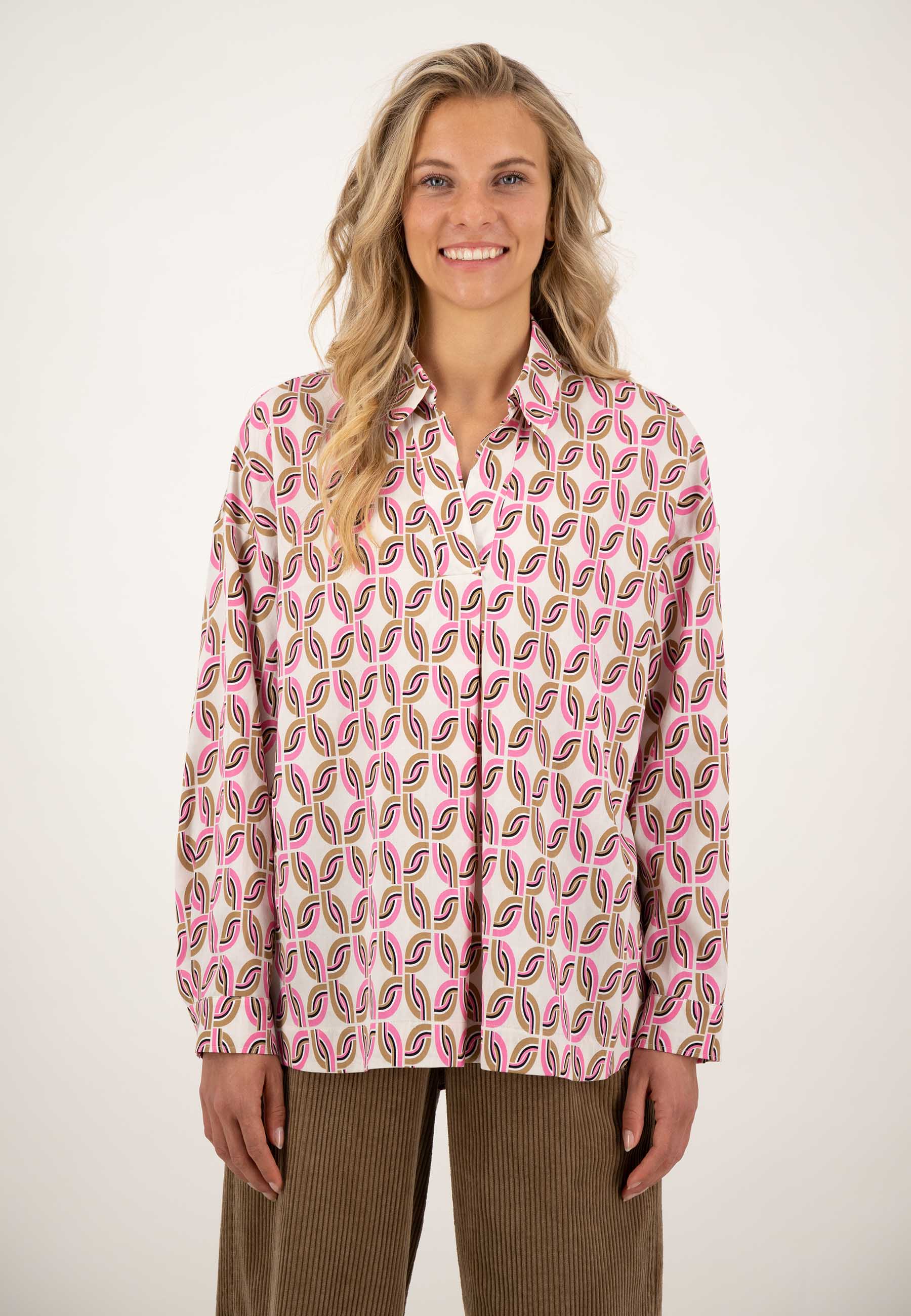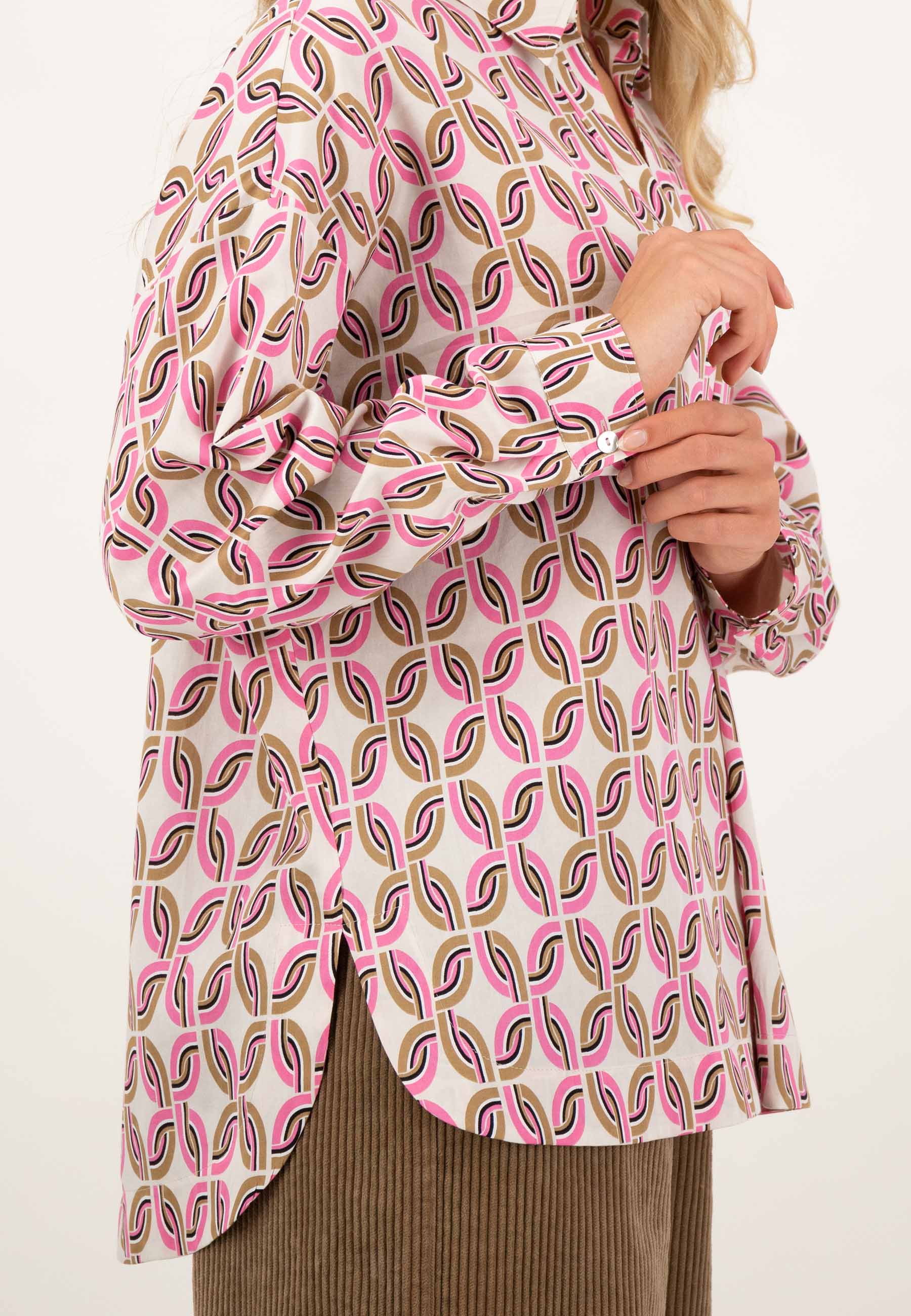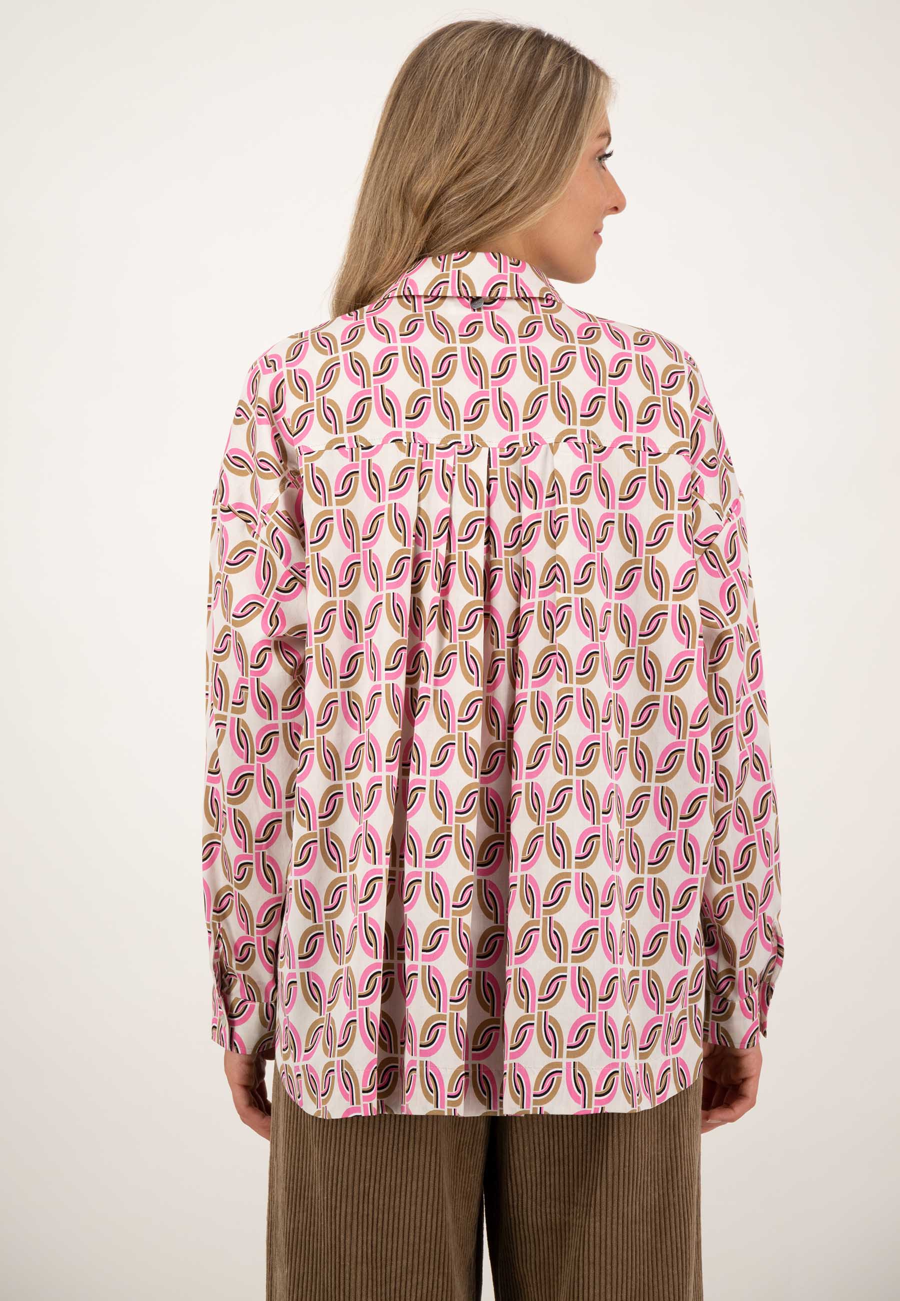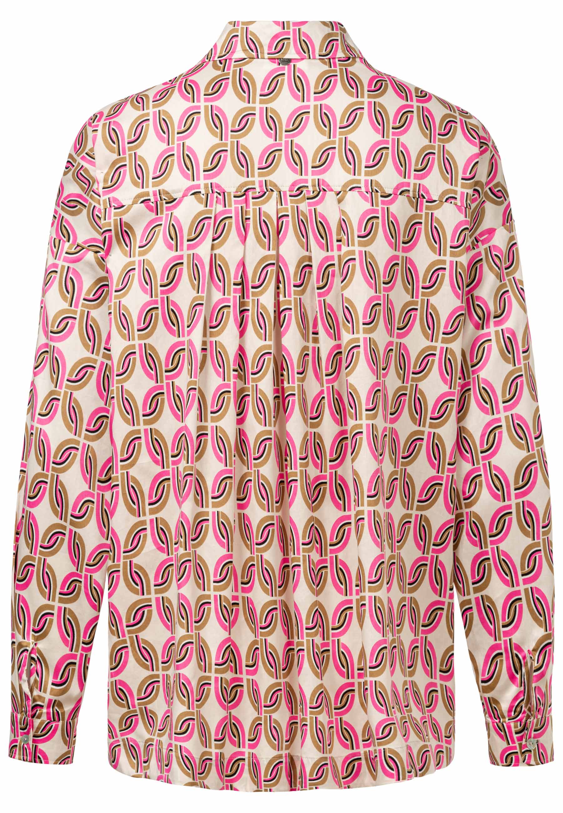 На сайте указаны российские размеры. Креативная блузка-рубашка модного кроя оверсайз. Яркие цвета и крой — выразительный графический принт убедительно сочетается со стильным кроем оверсайз. Этому способствует двухъярусный подол, удлиненный сзади, и боковые разрезы. Складки на спине с одной стороны обеспечивают легкое и свободное ниспадание рубашки. Классический воротник рубашки переходит в V-образный вырез, за которым следует складка на одной стороне, что также подчеркивает легкость блузки. Наша модель ростом 177 см. Измерения для размера 44: Окружность груди: 158 см Бедра: 153 см Длина по спинке: 72 см. Длина рукава: 50 см