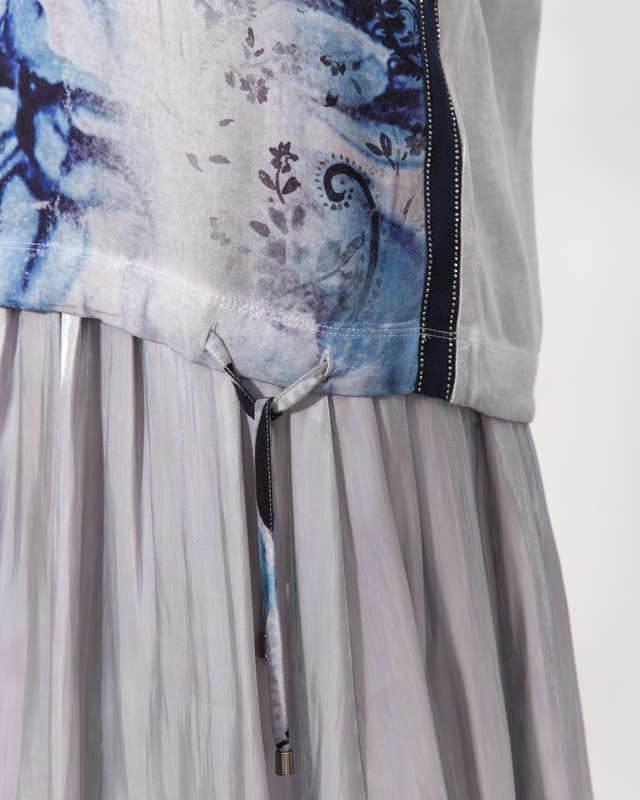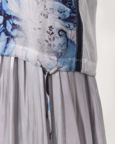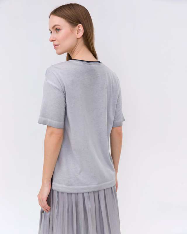 Блузка свободного кроя с абстрактным принтом спереди. Короткий втачной рукав, спущенная линия плеч. Круглый вырез горловины обрамлен контрастной бейкой.