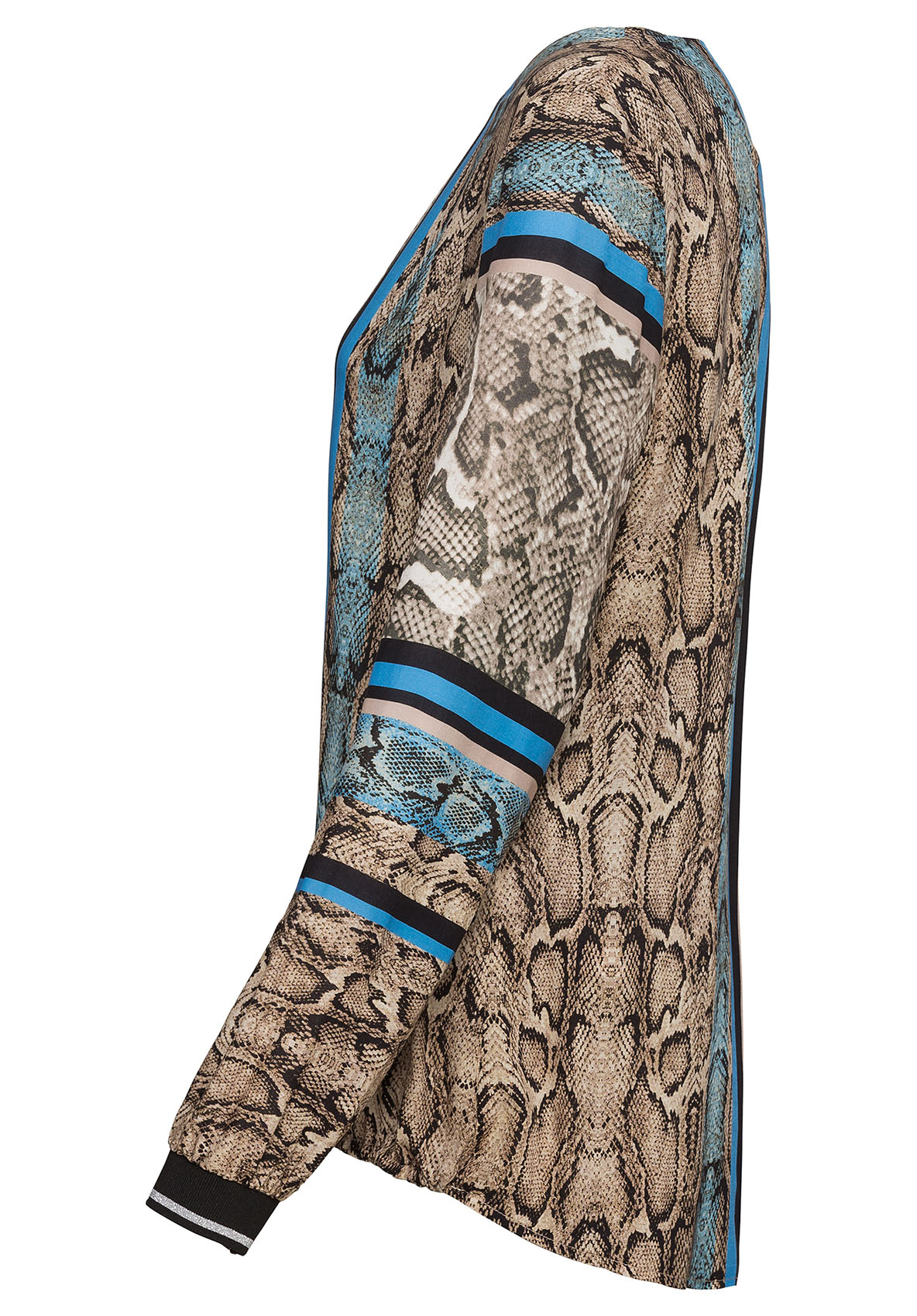 В дизайне блузы Anra сочетаются модный змеиный принт и трендовый эффект колор-блок. Мягкое вискозное полотно приятно и удобно в ношении. Рукава блузы можно закатать благодаря трикотажным манжетам. Кулиска на поясе позволяет регулировать прилегание изделия. Эта блуза - великолепный стильный выбор на любой случай. • блузка со змеиным принтом • 100% вискоза • трикотажные манжеты, кулиска по низу • прямой покрой • длина около 65 см