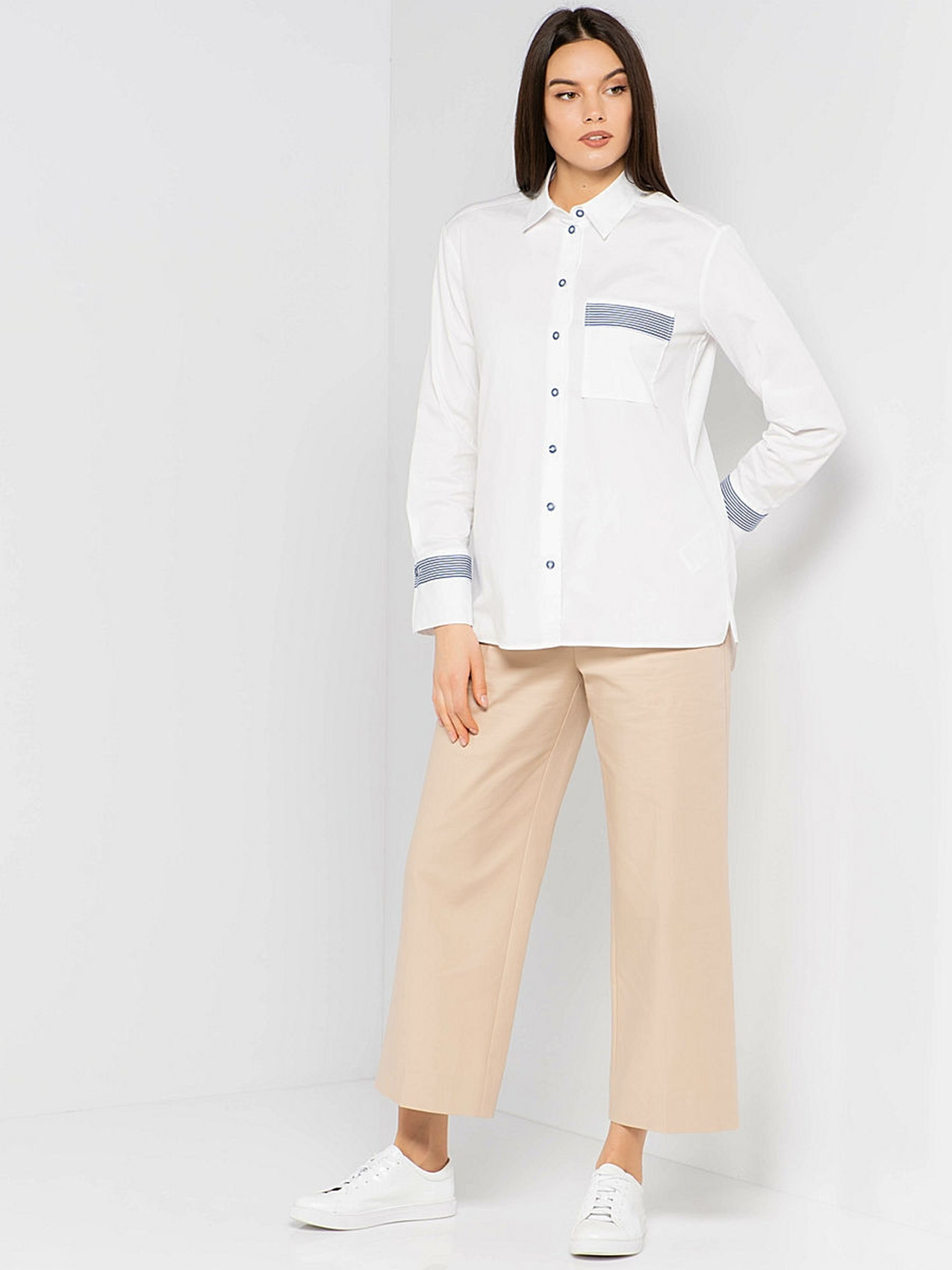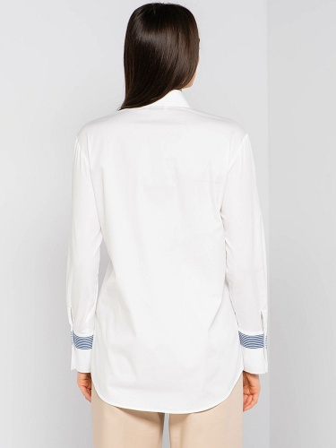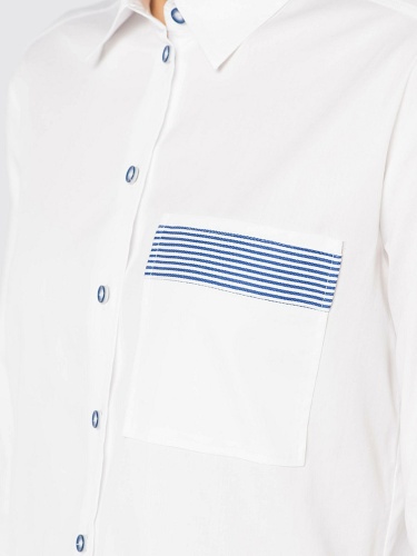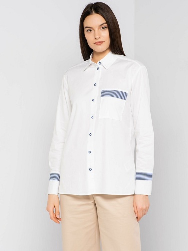 Белая блузка-рубашка слегка приталенного силуэта. Отложной воротничок, длинные рукава с манжетами, застежка на пуговицах, кармашек на груди. Простые, но элегантные акценты - темно-синяя полоска на отделке кармана и рукавов. Отличный вариант для создания делового образа.