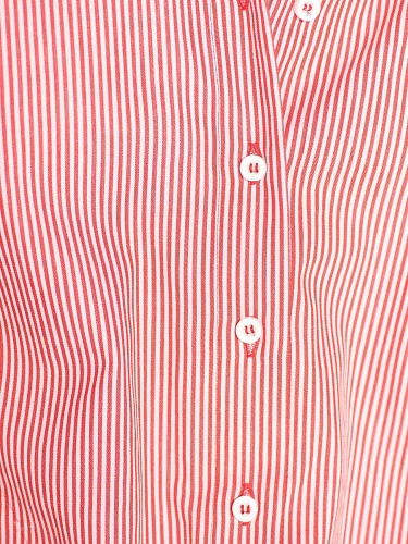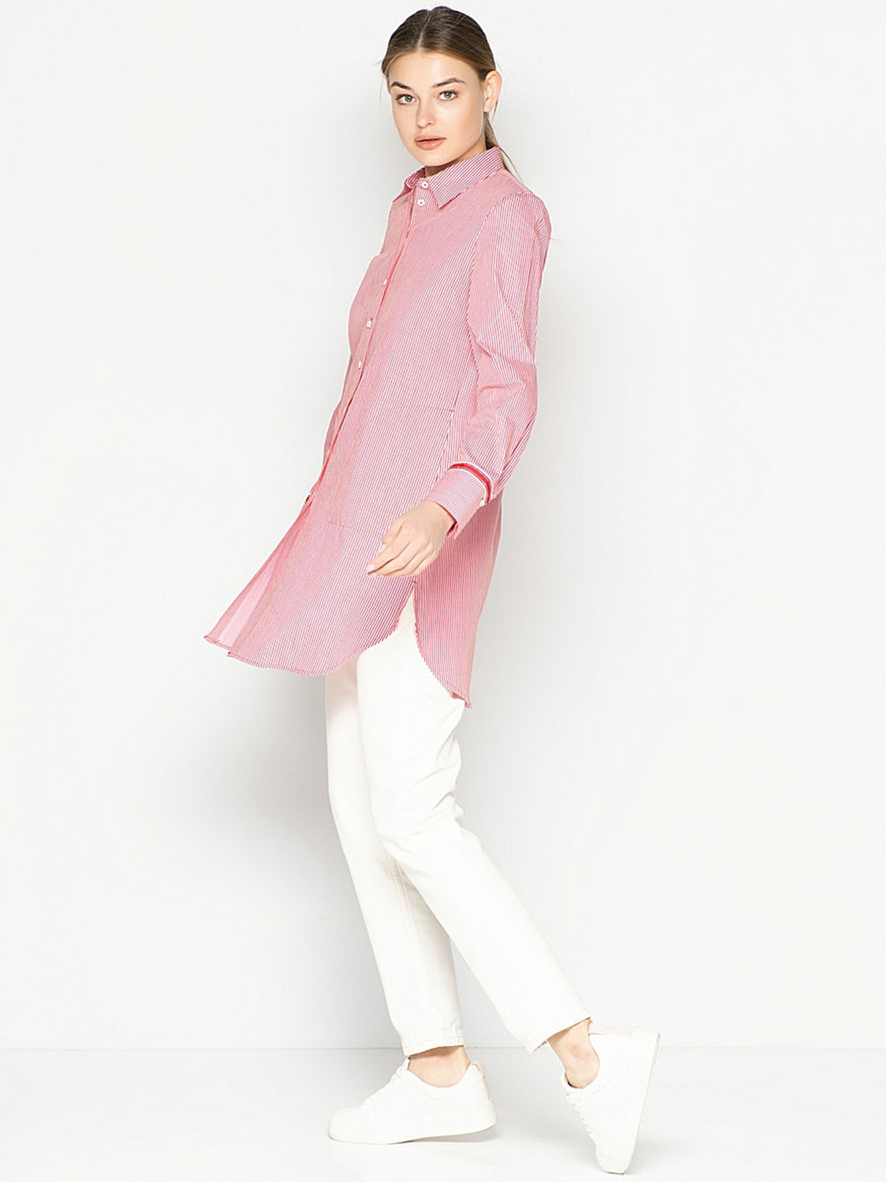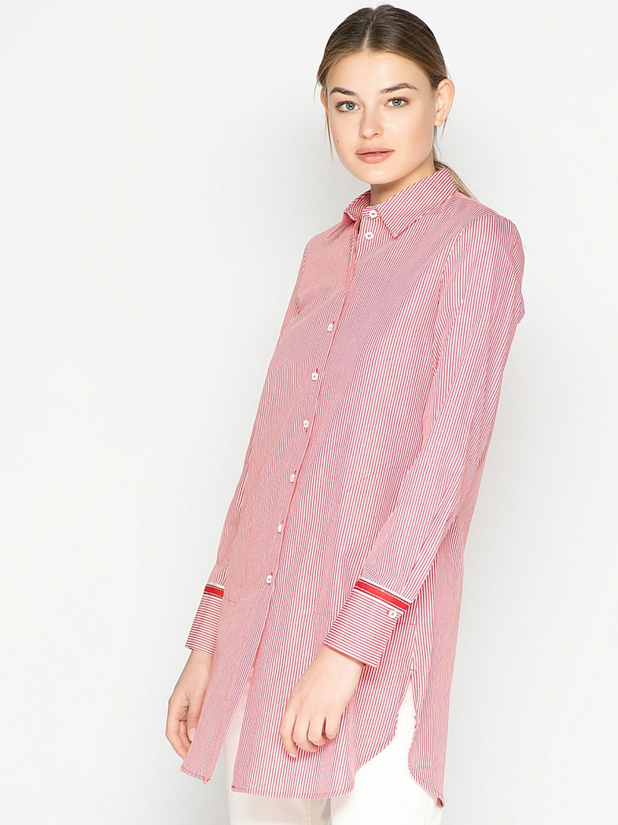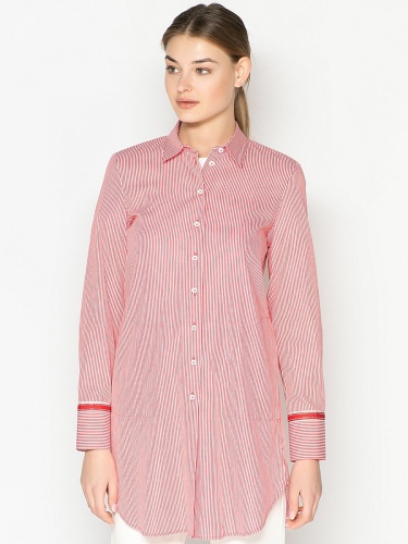 Удлиненная блузка в полоску. Слегка приталенный силуэт, отложной воротничок, застежка на пуговицах, длинные рукава. Отделка тесьмой на рукавах. Хлопковый материал блузки обеспечивает удобство и комфорт. Эта модель будет хороша как с классическими брюками, так и с джинсами.