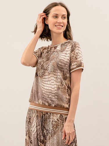 Блуза в анималистичном дизайне с трикотажными подвязами по низу изделия, по низу рукавов и по горловине. Прямой силуэт, круглый вырез горловины. Блуза может быть частью комплекта совместно с юбкой из аналогичного материала.