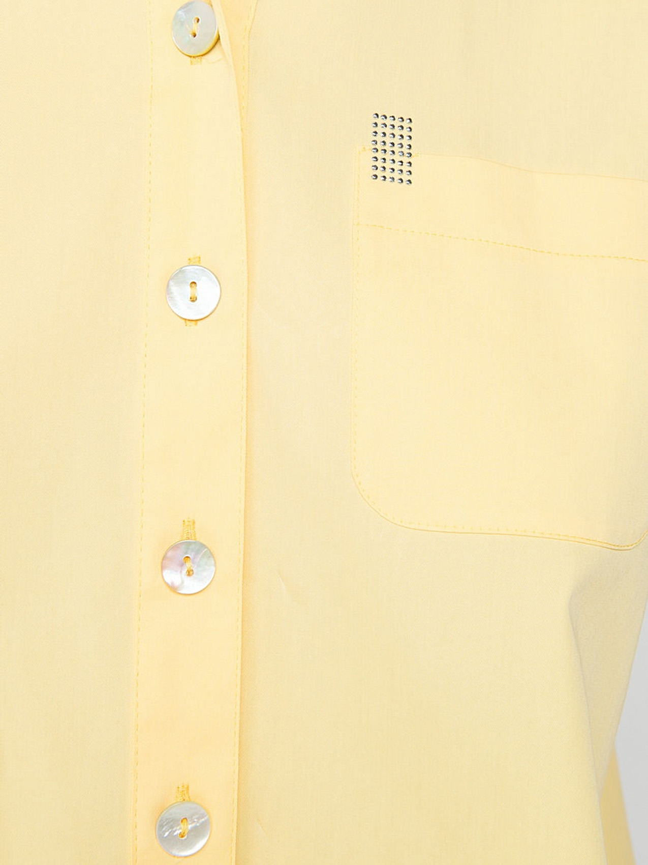 Легкая блузка в трендовом желтом цвете. Отложной воротничок, застежка на пуговицах, короткие рукава, закругленный нижний срез. Элегантная деталь - декорированный стразами кармашек на груди. Эта модель - отличный выбор для летнего делового образа.