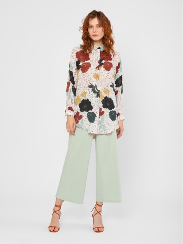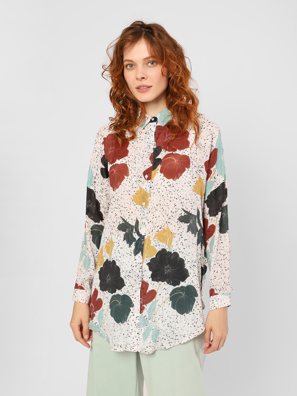 Блуза из смеси вискозы и шелка прямого удлиненного силуэта с классическим отложным воротником, спущенным плечом и втачным рукавом на манжете. Застежка спереди на пуговицы. Низ спинки удлиненный и закругленный, по бокам разрезы.