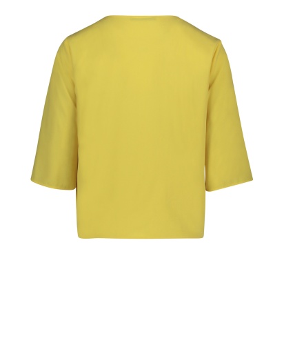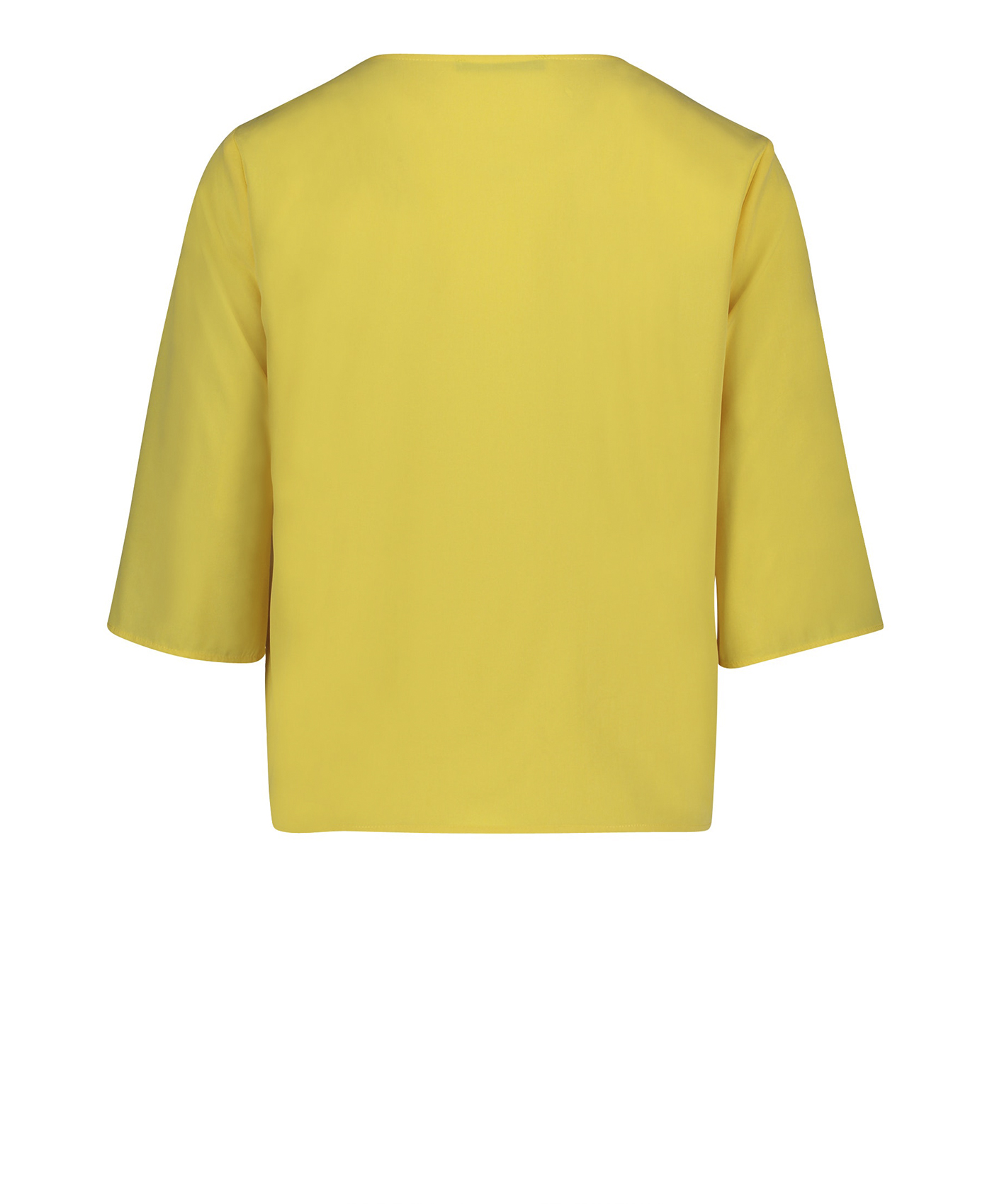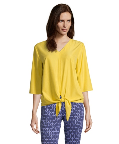 Стильная блуза прямого покроя. V-образный вырез горловины, рукава 3/4. Элегантная деталь дизайна - узелок на нижней части переда изделия. Приятный к телу материал из смеси тенсела и полиэстера. Однотонная блуза является универсальной моделью, с которой можно составить множество модных образов!