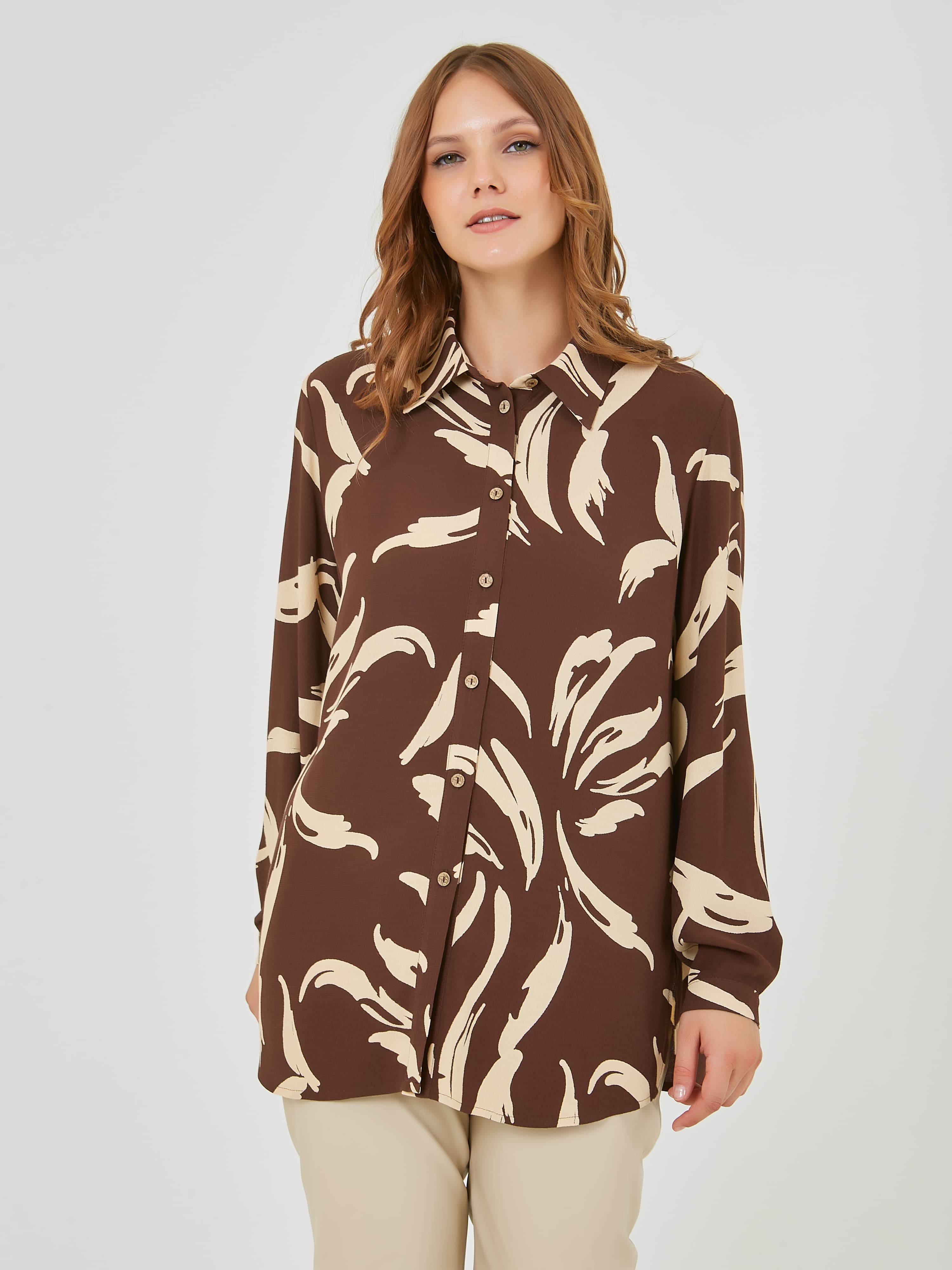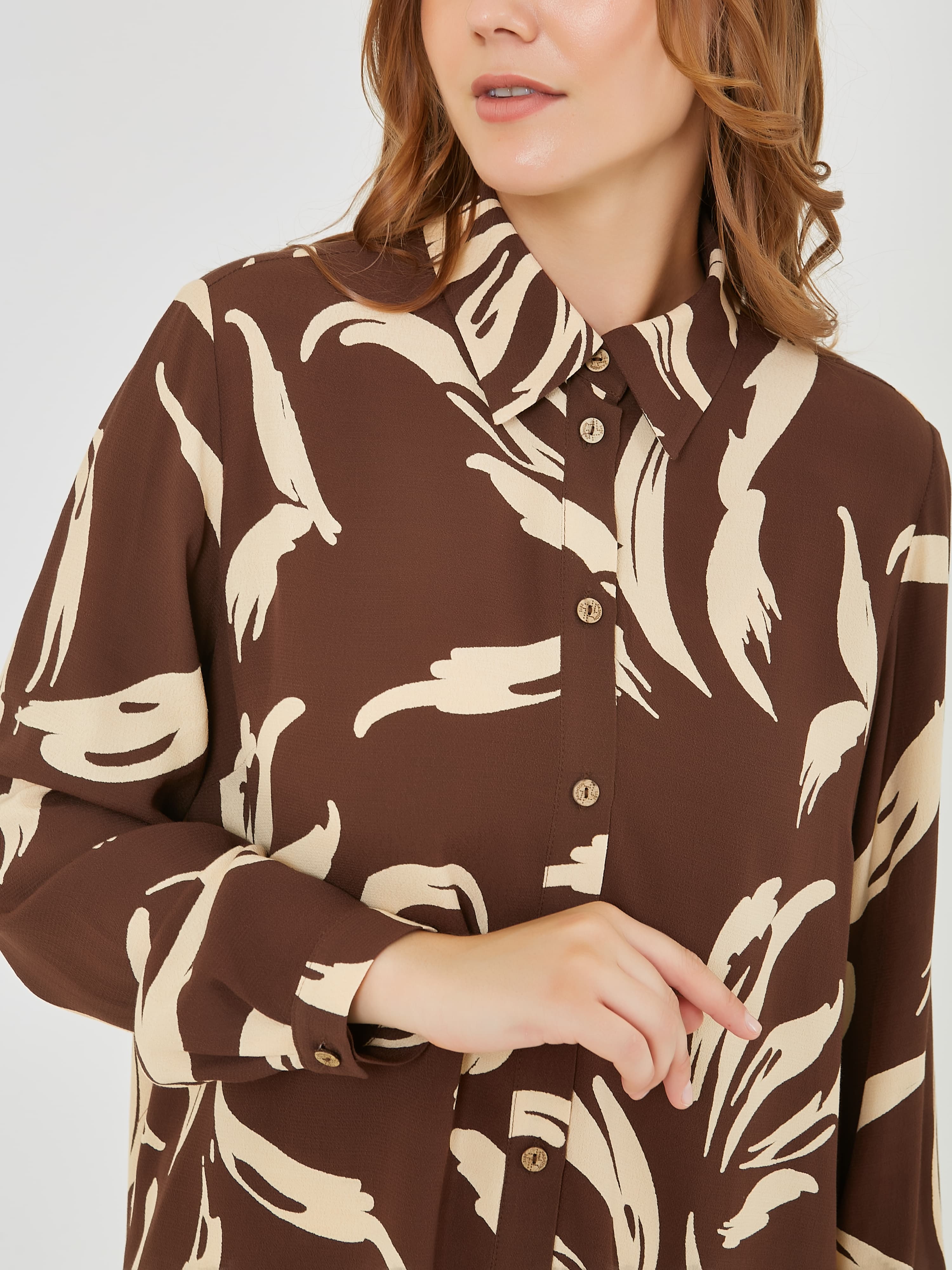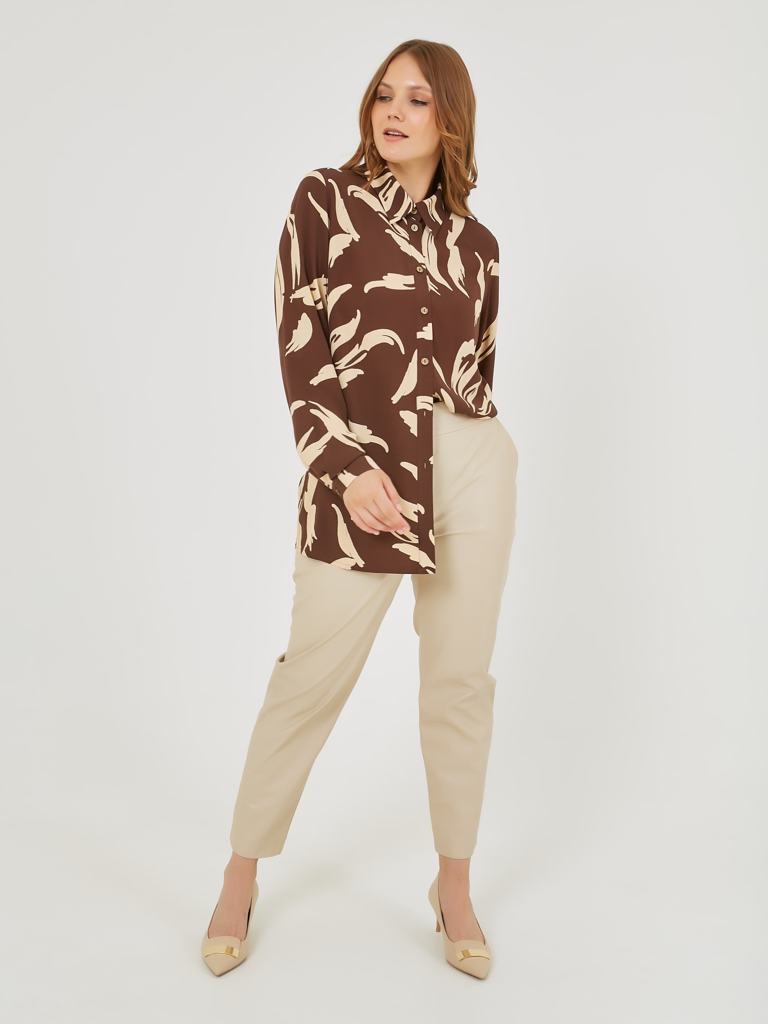 Лёгкая блузка из вискозы с планкой и застежкой на пуговицы по переду. Длинные рукава с узкими манжетами на пуговицах. Осень-Зима'25/26. Капсула "Хозяйка медной горы"