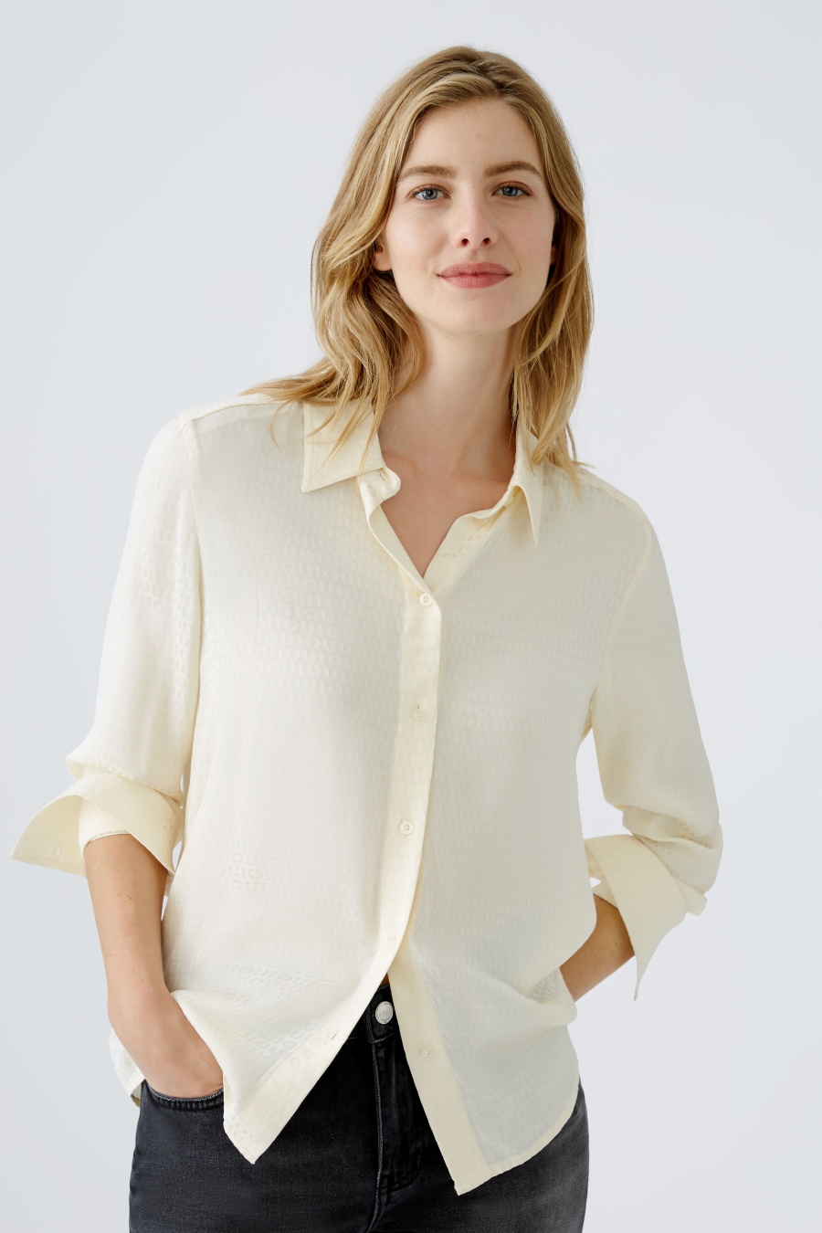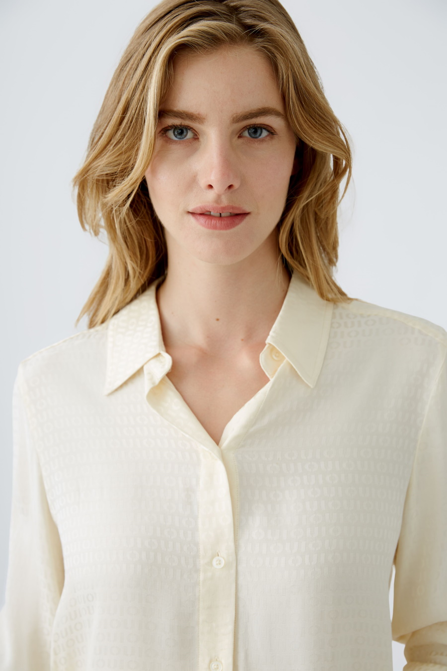 Свободная блуза OUI светло-бежевого цвета с принтом в виде логотипа, выполнена из вискозного атласа. Модель с отложным воротником, застегивается пуговицами в тон.
