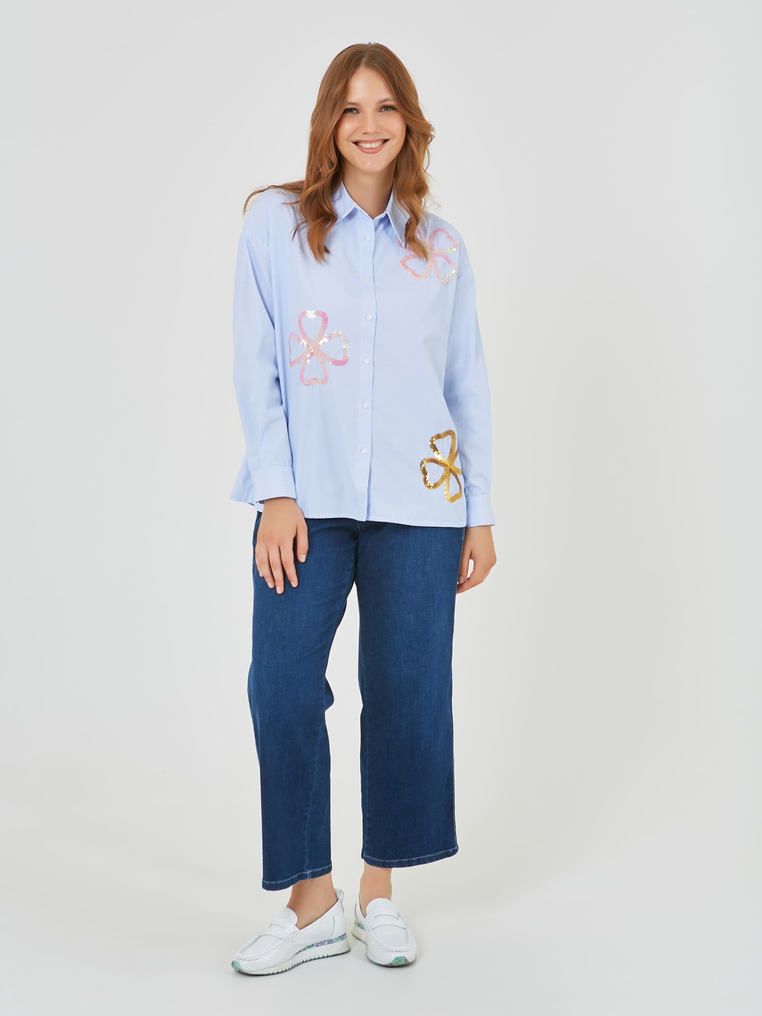 Классическая рабашка на пуговицах в вертикальную полоску. Украшена цветами из пайеток разных цветов. Коллекция Весна-Лето 2025. Капсула "Самарканд". Параметры модели: 95-64-101, рост 175, размер 44-46