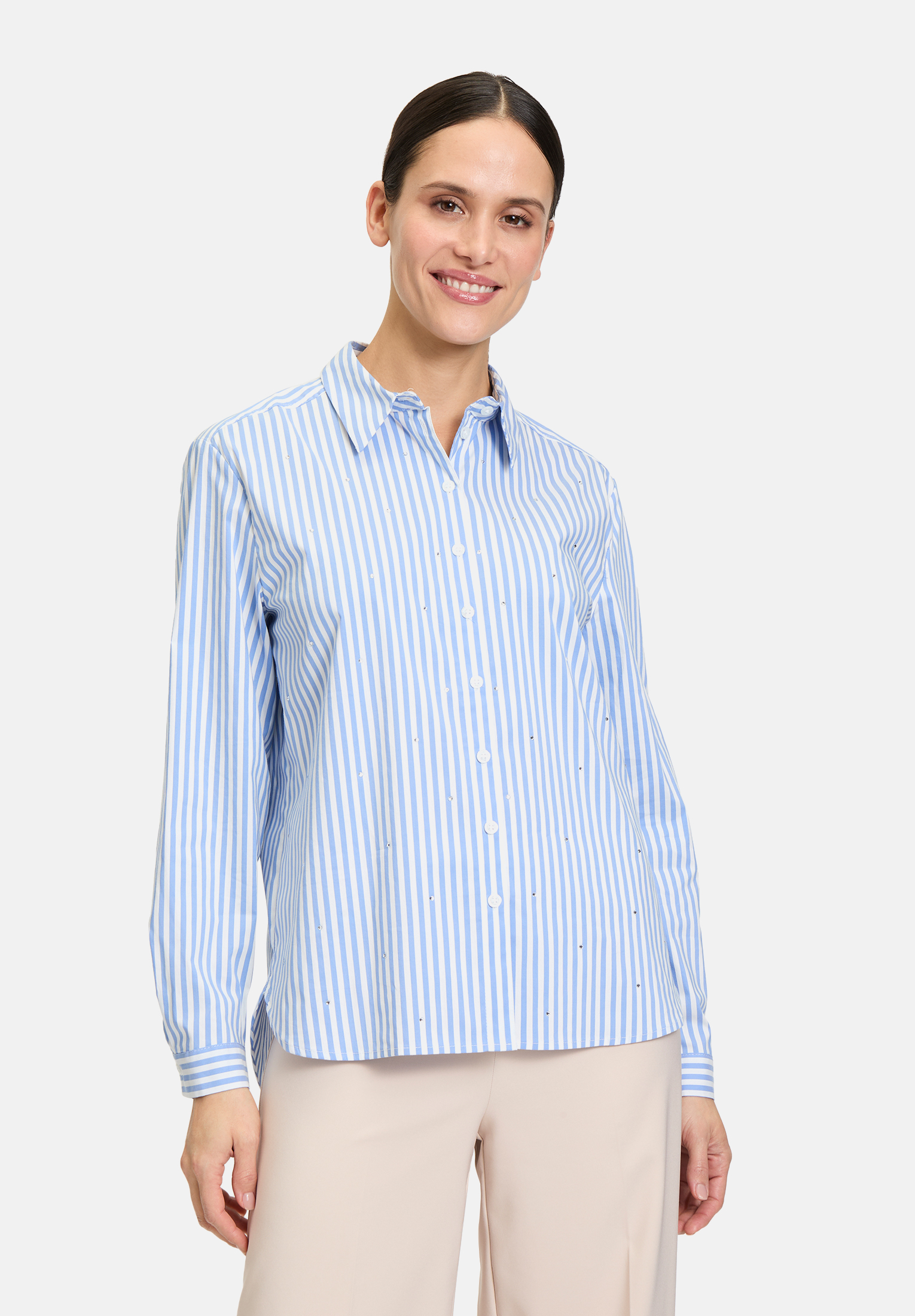 Повседневная блузка-рубашка с рубашечным воротником привнесет классический стиль в ваш гардероб. Полосатый рисунок и стразы придают блузке современный и свежий вид, а свободный крой обеспечивает высокий комфорт. Планка с пуговицами позволяет индивидуально подогнать блузку. Блузка идеально подходит для повседневных нарядов для отдыха, ее можно комбинировать различными способами, и она придаст любому образу непринужденную элегантность.