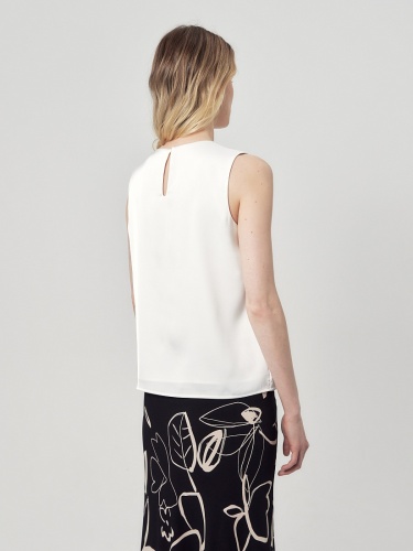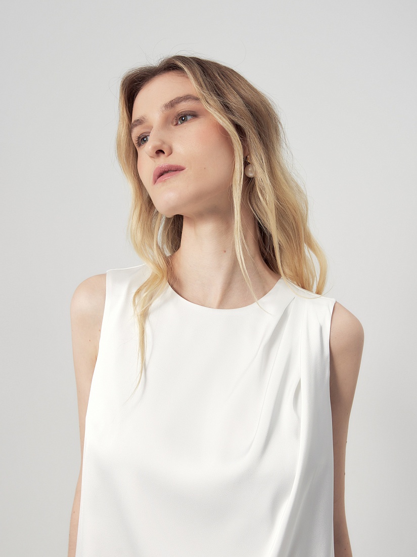 Прямая блуза из молочного атласа с круглой горловиной и складками по плечу. На спинке капелька и пуговицы.