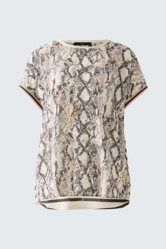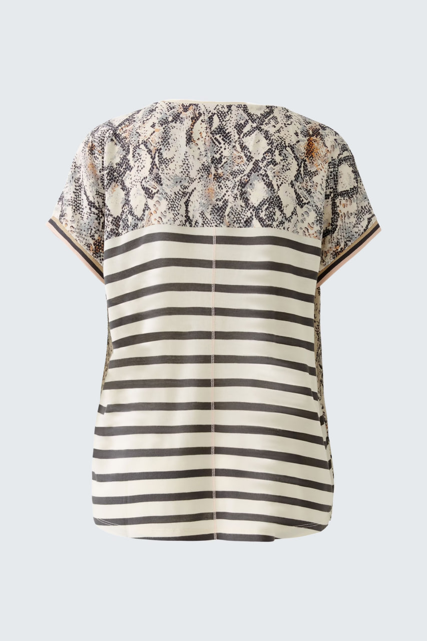 Изысканное исполнение достигается благодаря использованию чистой вискозы с завораживающим плетёным змеиным принтом, который украшает всю переднюю поверхность. Контрастная трикотажная спинка в полоску создаёт стильный дуэт с ярким принтом.