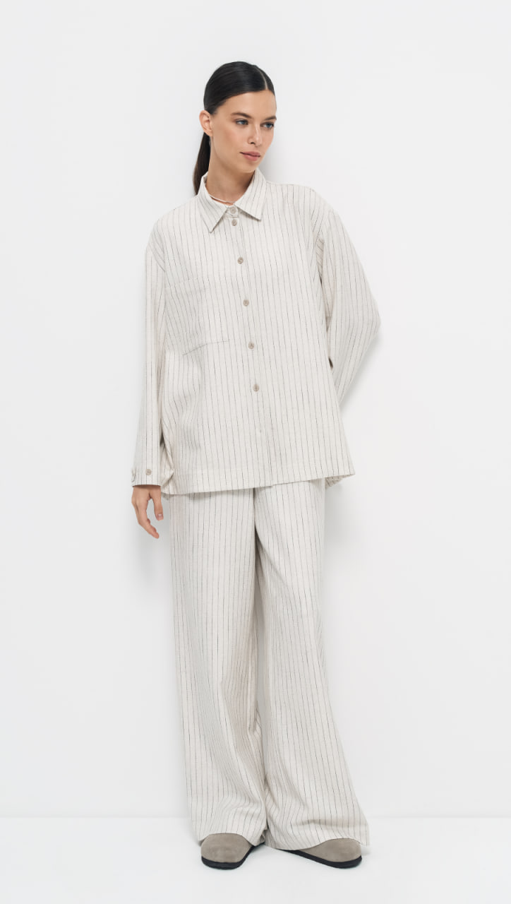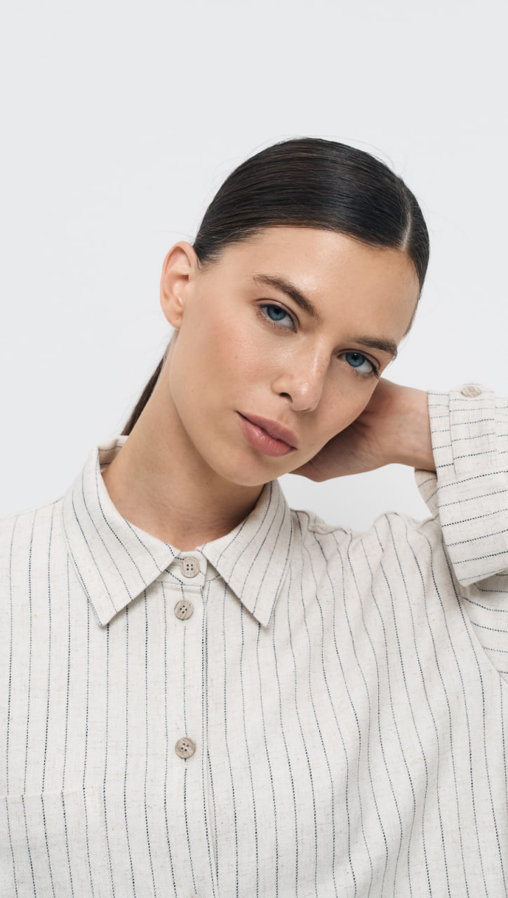 Блуза выполнена из ткани в полоску с содержанием льна, что придает изделию натуральность и текстурность. Цвет "льняной пергамент" добавляет модели нейтральности и универсальности.