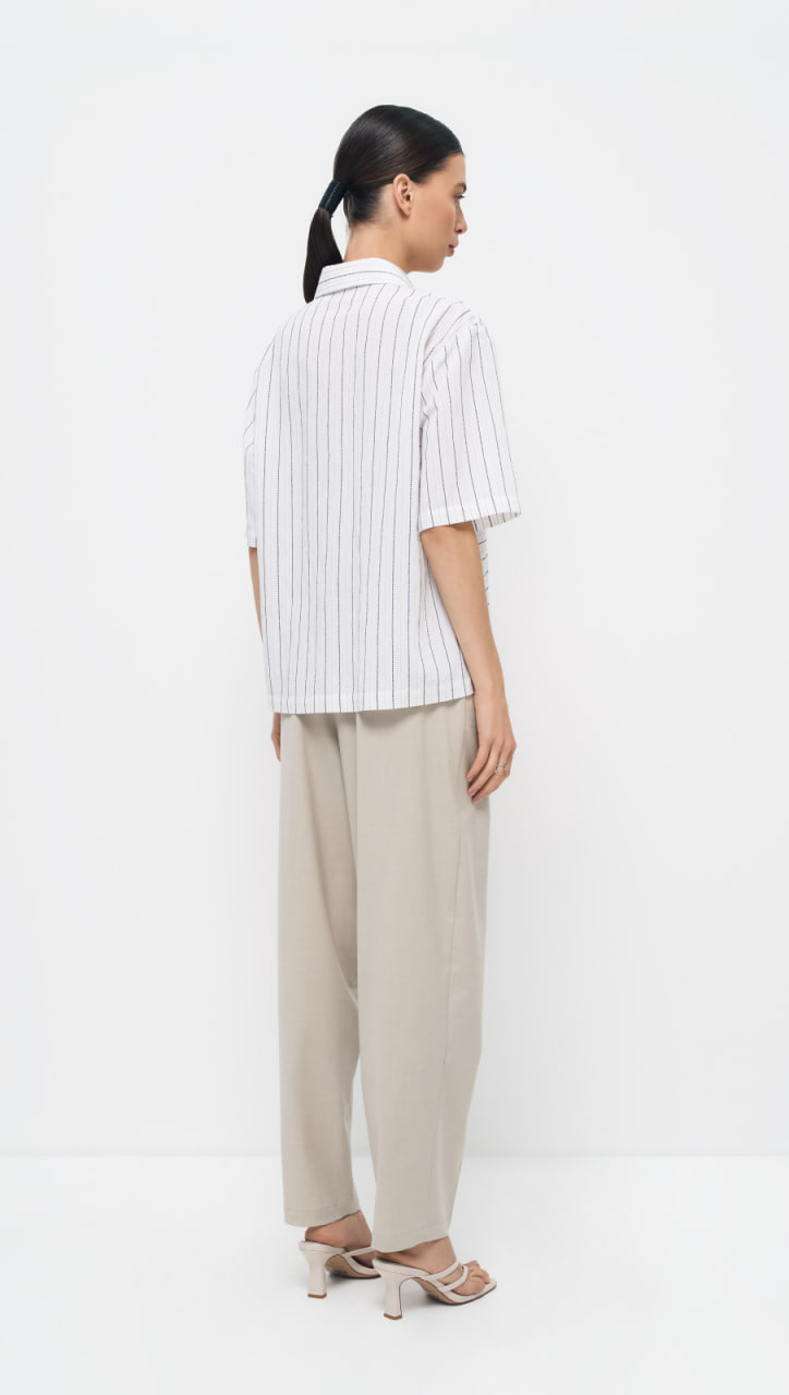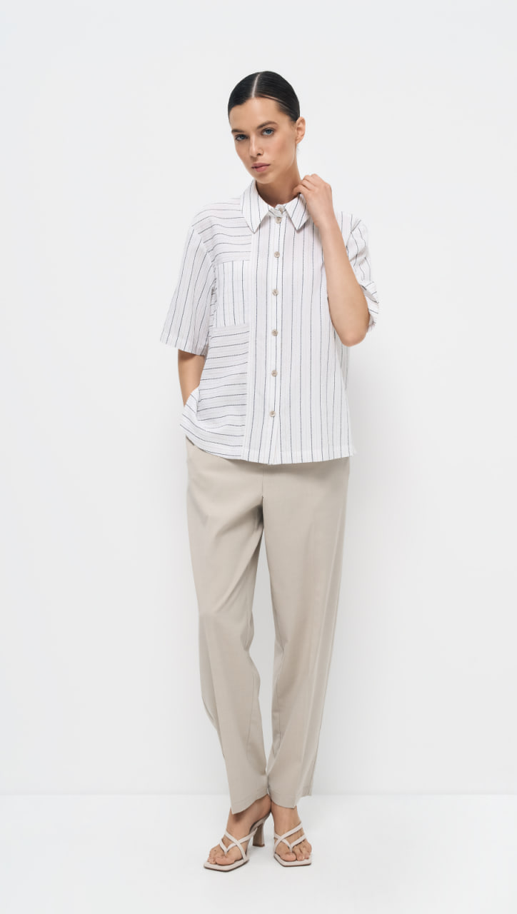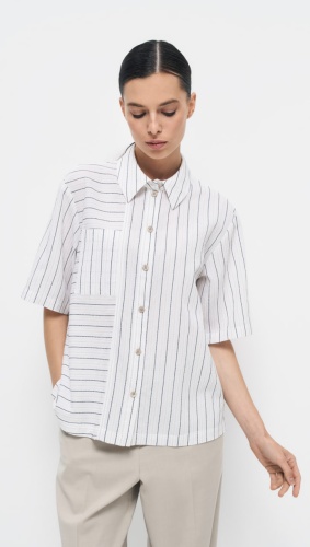 Блуза свободного силуэта выполнена из вискозы с вертикальными полосками, которые придают изделию стильный и современный вид. Цвет "белая амбра" отвечает за чувство свежести и чистоты.