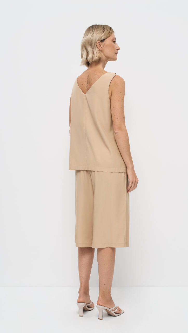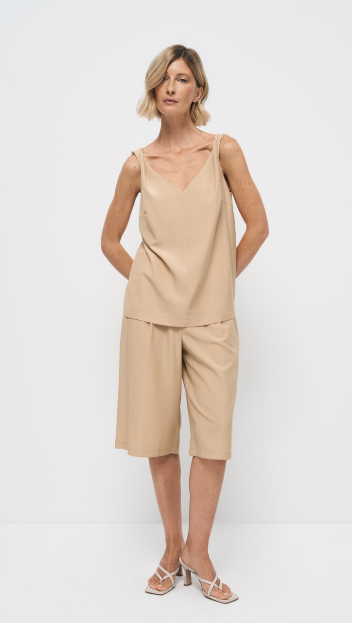 Основной материал – район, который искусно воспроизводит свойства натурального шелка. Этот материал славится своей мягкостью, гладкой поверхностью и отличной драпируемостью, что делает его идеальным выбором для создания легких и воздушных изделий. Цвет рафия добавляет блузе естественности и нейтральности, позволяя легко комбинировать её с другими элементами гардероба. Силуэт прямой, свободное прилегание. V-образный вырез горловины формирует четкий геометрический контур, способствующий визуальному удлинению шеи. Перекрученные бретели добавляют оригинальный штрих к общему образу, выделяя блузу среди аналогичных моделей.