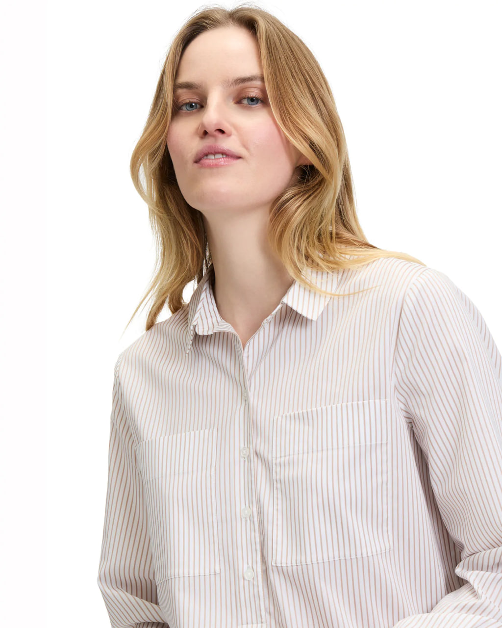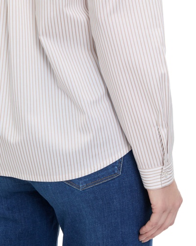Рубашка Betty&Co бело-бежевого цвета в вертикальную узкую полосу. Модель с отложным воротником и планкой на шесть пуговиц, рукава с узкими манжетами, накладные карманы на груди. Рубашка отлично впишется в ваш гардероб.