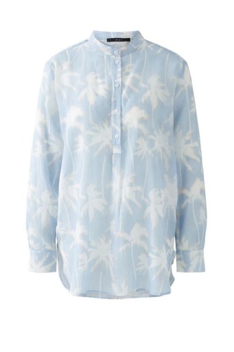 Рубашка с длинными рукавами, выполненная в нежном голубом оттенке. Ткань полупрозрачная, на нее нанесен изысканный принт в виде белых пальмовых листьев. Рубашка имеет классический воротник и застежку на пуговицах, длинные рукава можно закатать, чтобы придать образу более расслабленный и непринужденный вид.