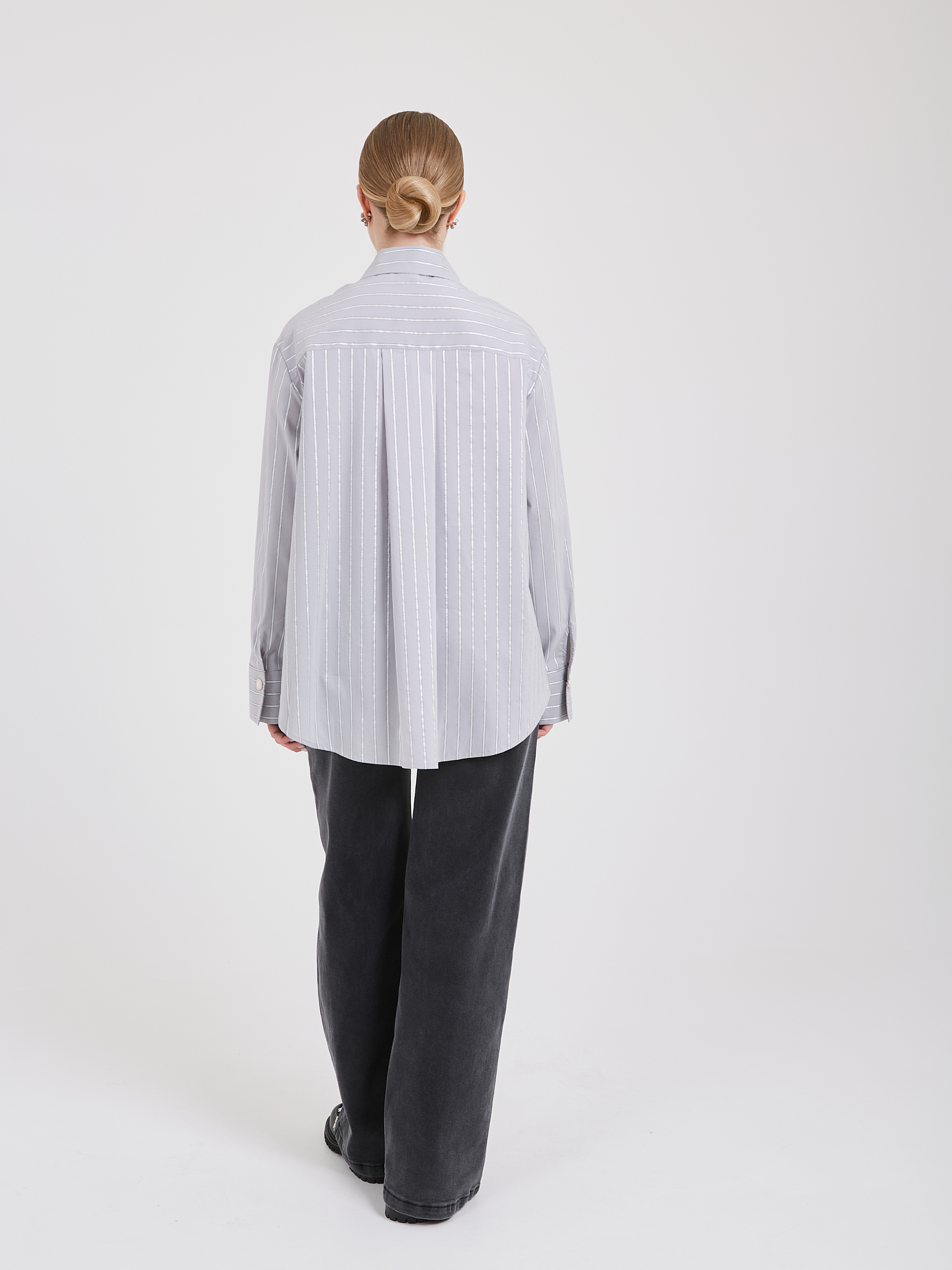 Серая рубашка с классическим воротником и манжетами. Длинные рукава и аккуратные вертикальные полосы делают образ строгим и элегантным.Осень-Зима'25/26. Капсула "Вишневый сад"