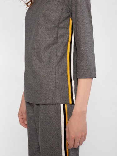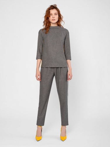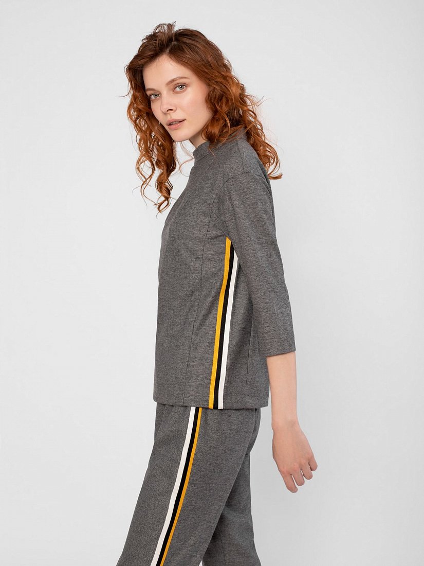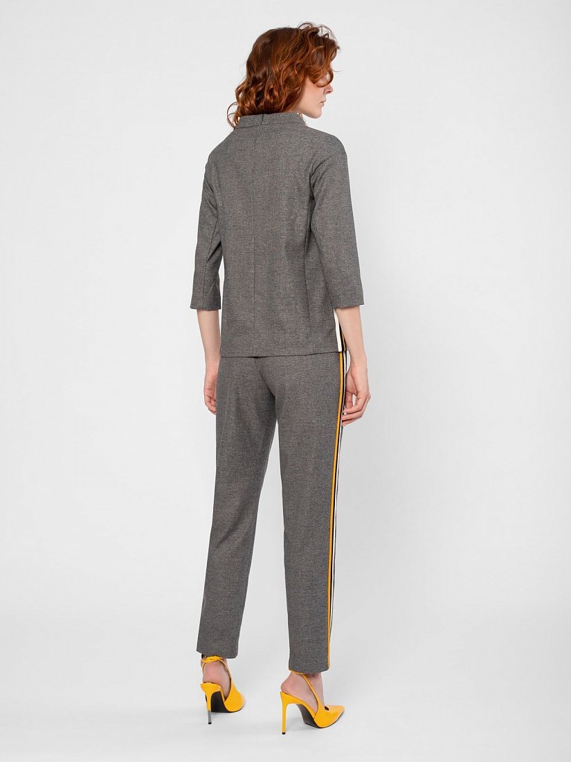 Блуза из костюмной ткани прямого силуэта с воротником стойка, спущенным плечом и укороченным рукавом. По бокам контрастные лампасы из тесьмы в полоску. Сзади застежка на потайную молнию.
