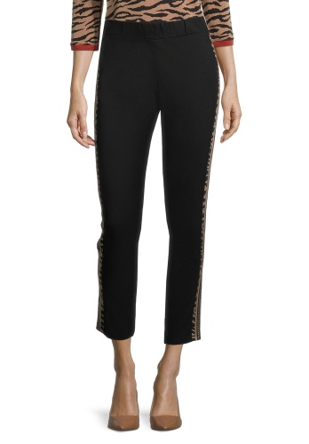 Укороченные брюки в сопртивном стиле. Средняя посадка с эластичной лентой на поясе обеспечивают удобство в ношении. Яркий акцент модели - вставки-лампасы с анималистическим принтом. Приятный к телу материал из вискозной смеси.