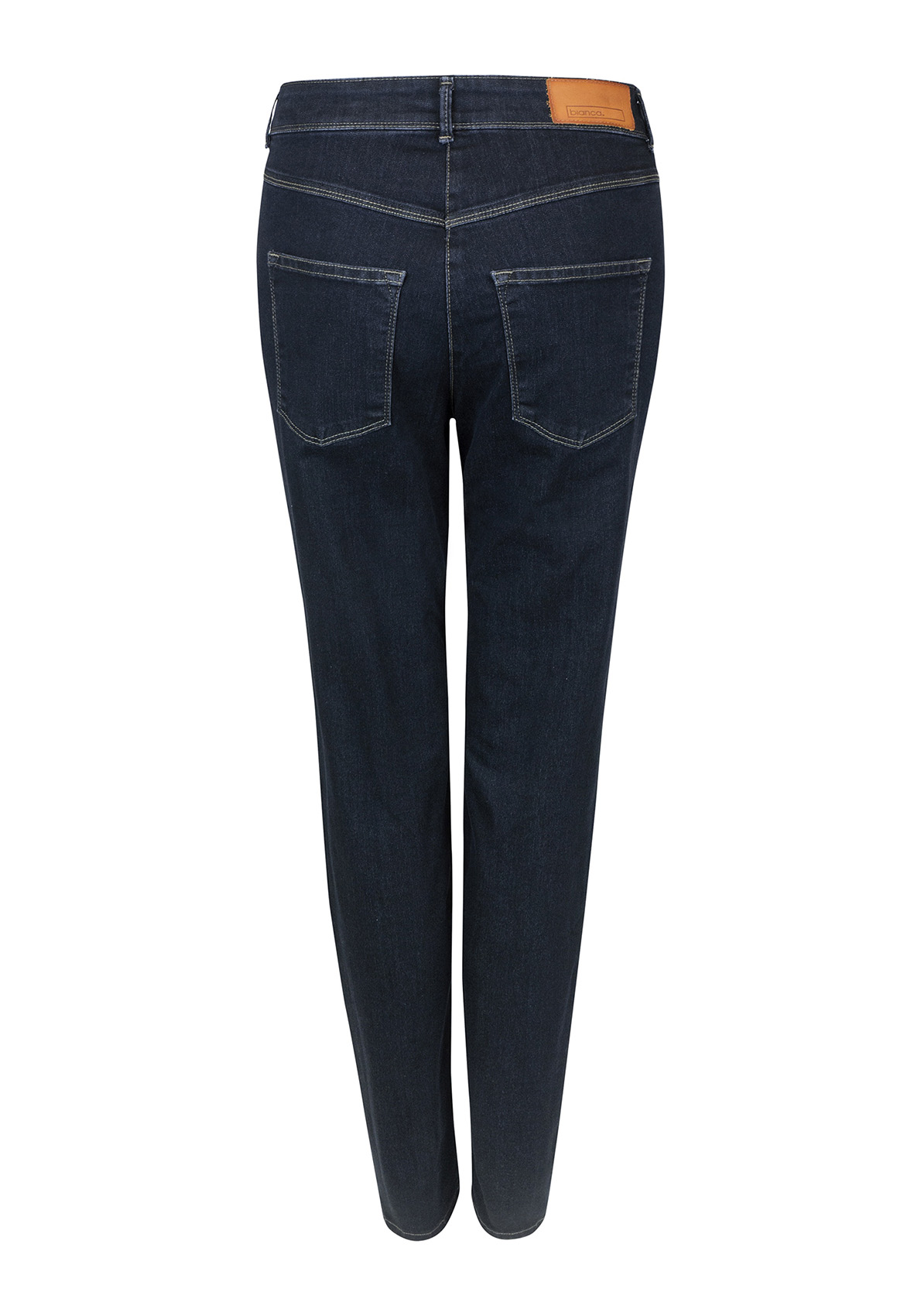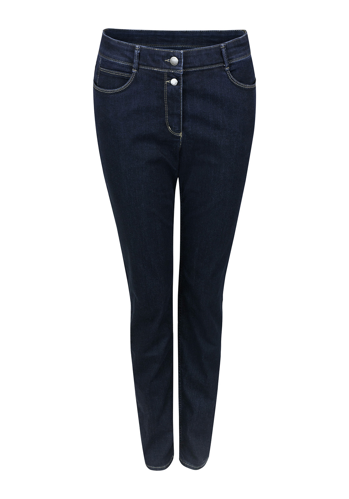 Модные джинсы с пятью карманами. Высокий пояс на пуговицах, зауженный крой. Модель очень комфортна в носке благодаря материалу из эластичной хлопковой смеси. Джинсовые брюки полной длины идеально подходят к любому стильному образу благодаря своему лаконичному дизайну. Эта модель идеально сочетается как с женственной блузкой, так и с повседневной футболкой.