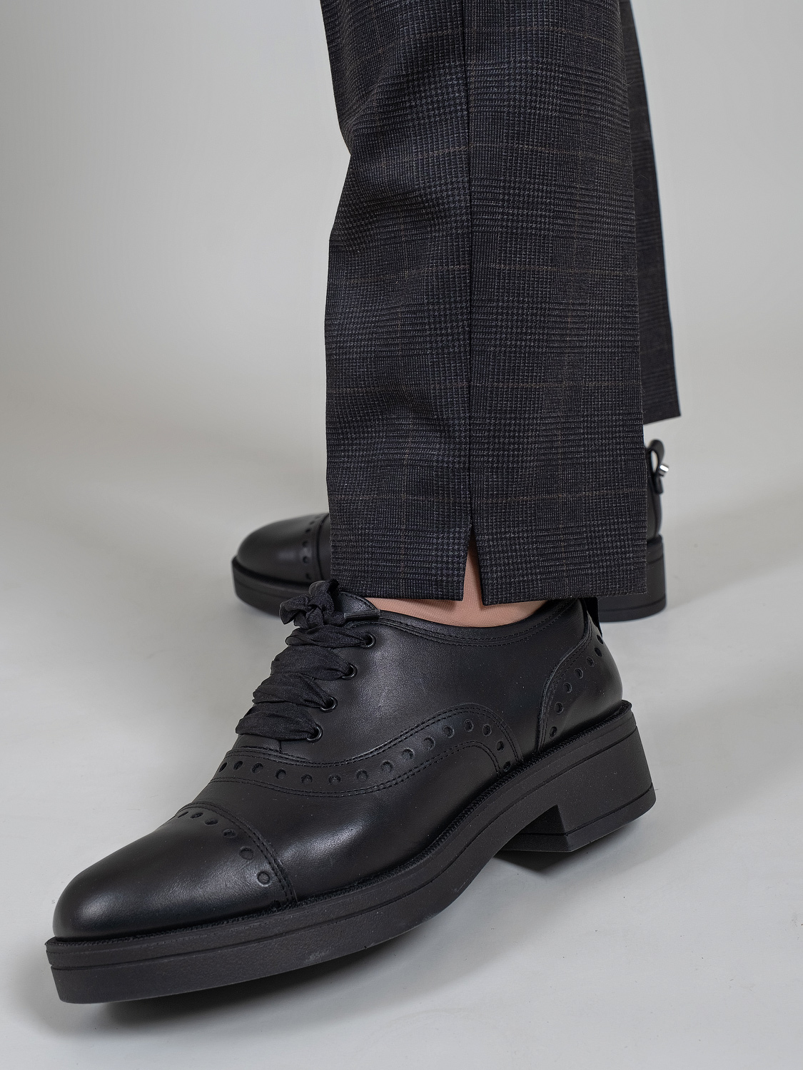 На сайте указаны российские размеры. Брюки средней посадки в клетку отличный вариант для офиса и повседневной носки. Состав материала из смеси вискозы и полиэстера обеспечивает эластичность и хорошую посадку по фигуре. Имеются два боковых кармана. Ткань: костюмная смесовая ткань средней плотности (65% вискоза, 27% полиэстер, 8% эластан). Идеальна для межсезонья и холодного времени года. Крой: классическая прямая модель брюк по фигуре. Имеет завышенную линию талии, которая гармонизирует и вытягивает силуэт, скрывая недостатки, а также два функциональных кармана по бокам. Прекрасный крой и хорошо подобранный состав ткани позволяет брюкам садиться на разные типы фигур – в линейке представлены размеры от 46 до 54. Отделка: небольшие разрезы в области щиколоток добавляют удобства при ходьбе, а еще эта особенность позволяет носить брюки с различной обувью – высокими и низкими ботинками, туфлями и кедами.