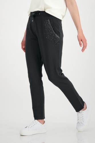 Брюки спортивного стиля. Эластичный пояс с кулиской обеспечивает удобную посадку и комфортное ношение. Мягкий и приятный телу материал. Боковые карманы украшены стразами. Сзади накладные карманы.