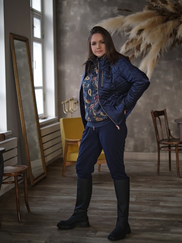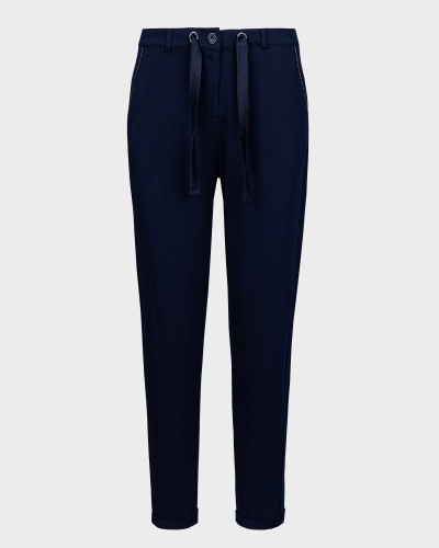 Однотонные брюки из 100%-го хлопка. Врезные боковые карманы украшены стразами. Эластичный пояс на кулиске и шнурок в тон брюк. Застежка–молния и пуговица.