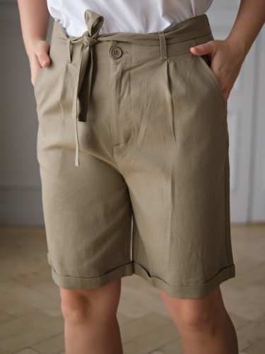 На сайте указаны Российские размеры. Однотонные шорты из смеси льна и вискозы незаменимы в теплую летнюю погоду. Материал обеспечивает правильную терморегуляцию и приятен к телу. Длина шорт выше колена, имеются стрелки и отвороты. Застежка на скрытую молнию и пуговицу. В комплекте идет пояс в тон изделия. Боковые внутренние карманы, задние карманы отсутствуют. Фигурные вытачки и пояс со шлевками обеспечивают комфортную посадку.