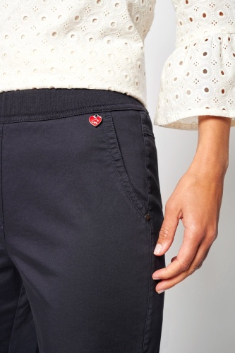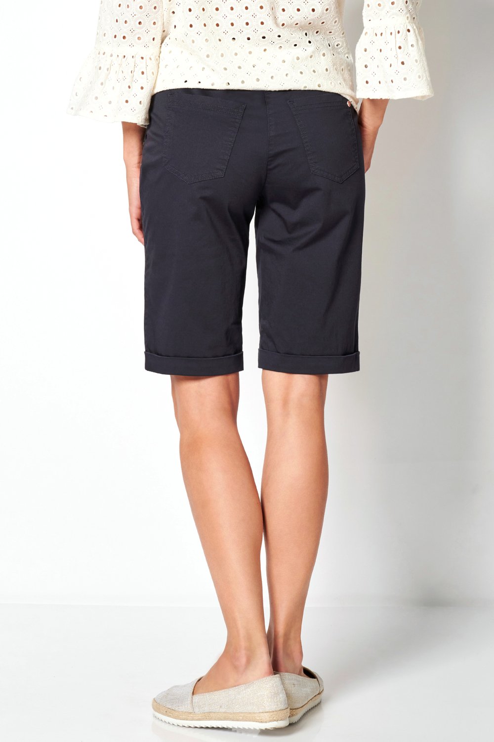Однотонные шорты в базовом темно-синем оттенке – идеальный вариант низа для повседневного образа в теплое время года. Длина до колена позволяет надеть шорты в офис или на встречу, если сочетать с верхом в деловом стиле. Комфортная высокая посадка. Застежка на скрытую молнию и пуговицу. Боковые изогнутые карманы спереди, накладные карманы сзади.