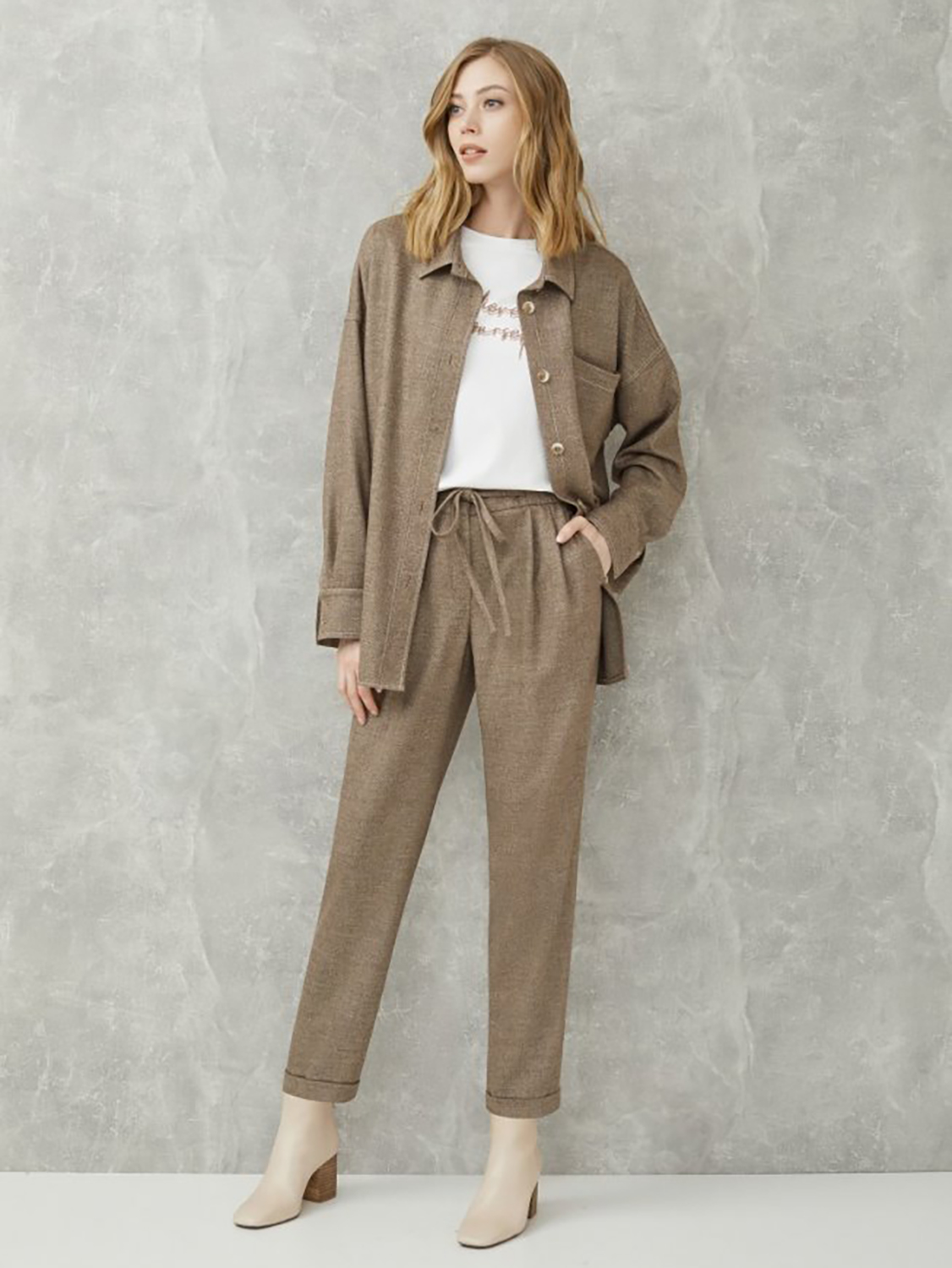 Однотонные брюки прямого кроя с отворотами. Эластичный пояс с кулиской обеспечивает комфортное ношение. Боковые врезные карманы. Брюки отлично сочетать с рубашкой из комплекта или надевать вместе с джемпером или блейзером.